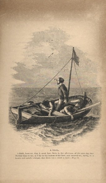 London, T. Nelson and Sons, 1852, in-16, bella legatura coeva in piena pelle rossa con fregio impresso a secco allo specchio dei piatti entro doppia cornice oro, esterna più ricca ed interna con eleganti angolari, dorso a 6 scomparti con titolo e fregi oro, tagli dorati, pp. (2), XVI, 333, (3). Doppio frontespizio, di cui uno figurato con mozzo che sale sulle sartie e 5 tavole (un po' brunite). Doppio ex libris: della Bradford Grammar School, con libro coronato e motto “Hoc Age” e Schlesinger (allieva a cui fu dato come libro-premio nel 1853). Piatto anteriore e prime carte staccate, cuffie erose. Prima edizione.