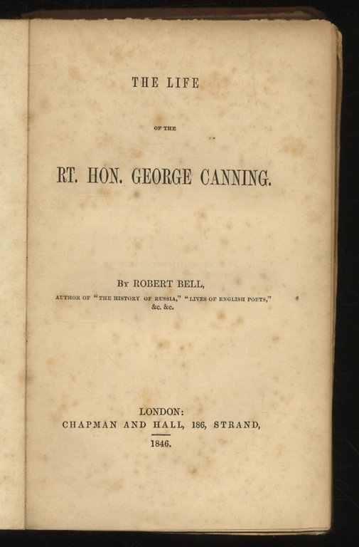 London, Chapman and Hall, 1846, in-8, tela editoriale (priva del dorso e con piatto anteriore staccato), pp. 368. Biografia del primo ministro e politico Tory John Canning. Prima edizione.