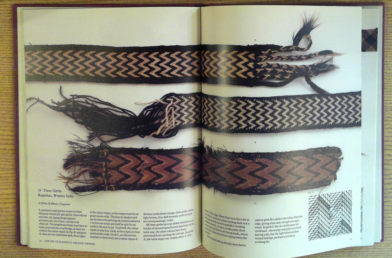 A clean, unmarked book with a tight binding. 8 1/2"w x 11 1/4"h. 160 pages. Many color photographs of objects using threadlike elements, ranging from Indian camel girths to springs of an army Jeep seat, to Japanese triaxial silke to Botswanan beer strainers, etc.