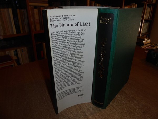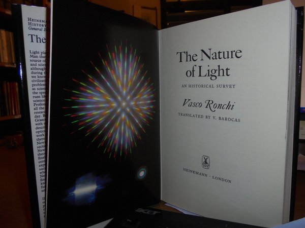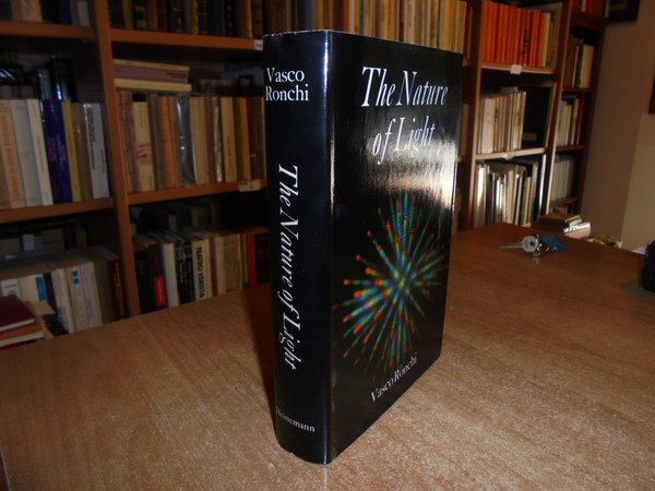VASCO, RONCHI. London, Heinemann, 1970. The Nature of Light an historical survey. In-8° piccolo, tela verde edit. con titoli in oro al dorso, sovracopertina ill. a col. xii, 288 pp. con 96 illustrazioni in tavole fuori testo anche a colori. Come nuovo. Uff. C - II - 4