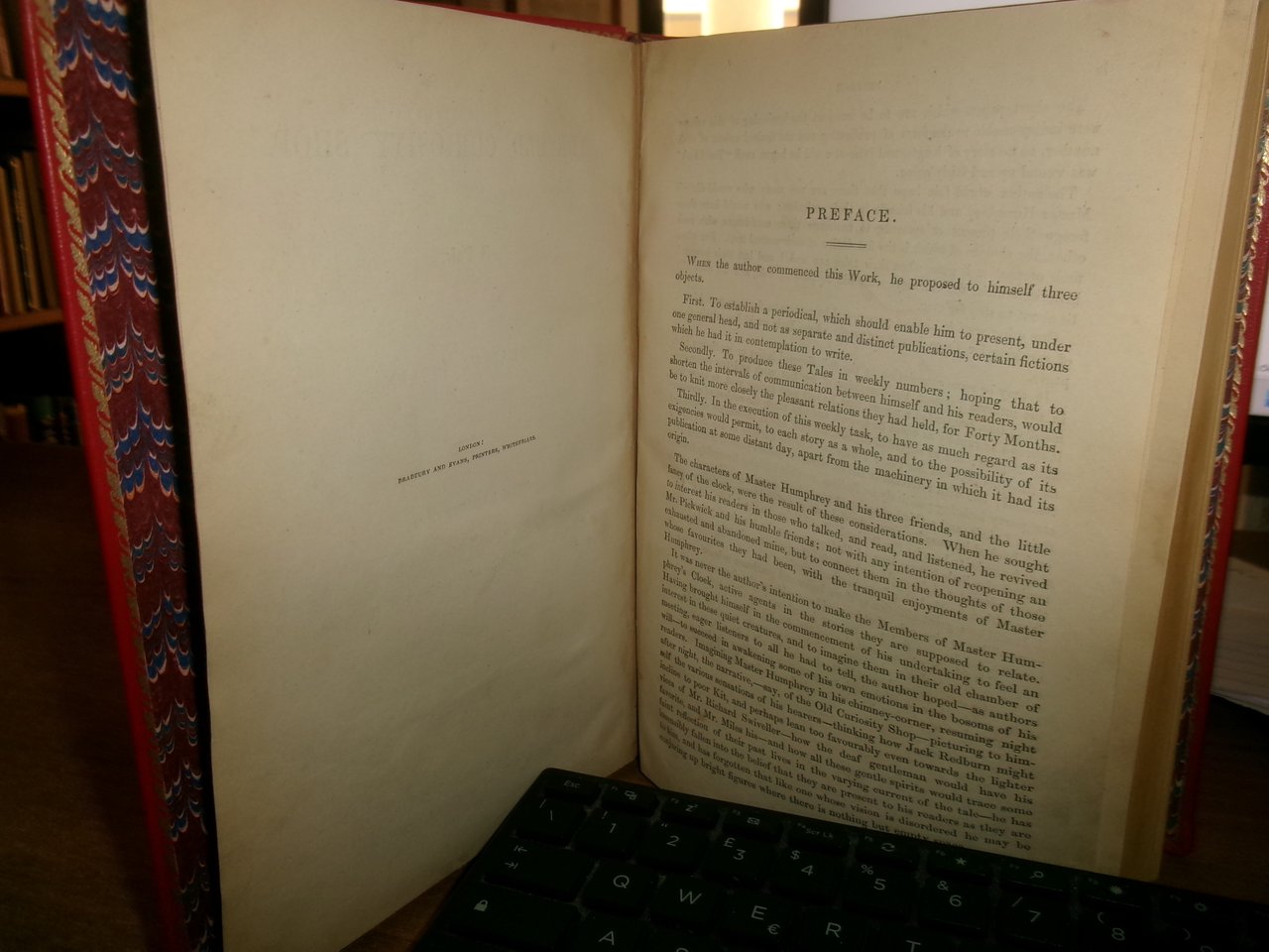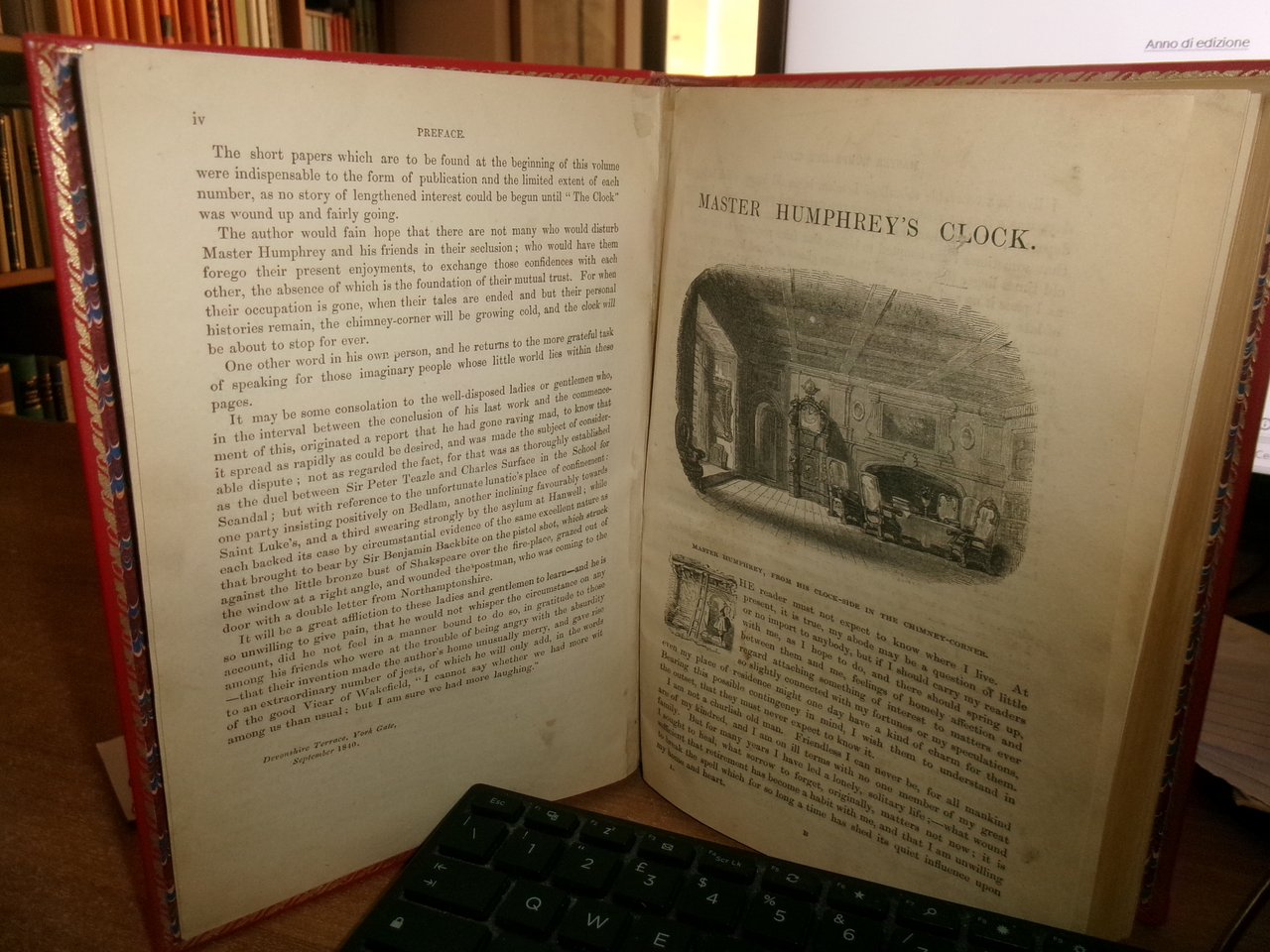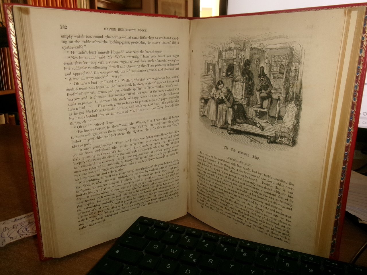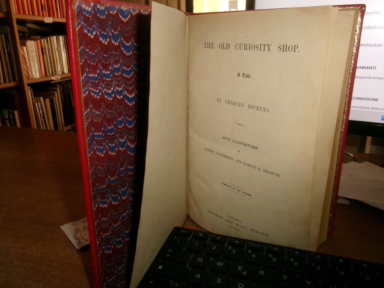 DICKENS, Charles. The Old Curiosity Shop. A tale. With illustrations by George Cattermole and Hablot K. Browne. Complete in one volume. London, Chapman and Hall, Strand, 1841. In - 8°, piena pelle rossa con bordura riquadrata sui piani impressa in oro, dorso a nervi con decorazioni auree. iv, 306, 228 pp. con numerose figure caricaturali incise in legno intercalate n.t. Rara edizione originale. His best work being for The old curiosity shop, which gave him most scope for dramatic and athmospheric effects and strong characterrisation... (Houfe, Dictionary of British book illustrators, p. 169. Neg. 7