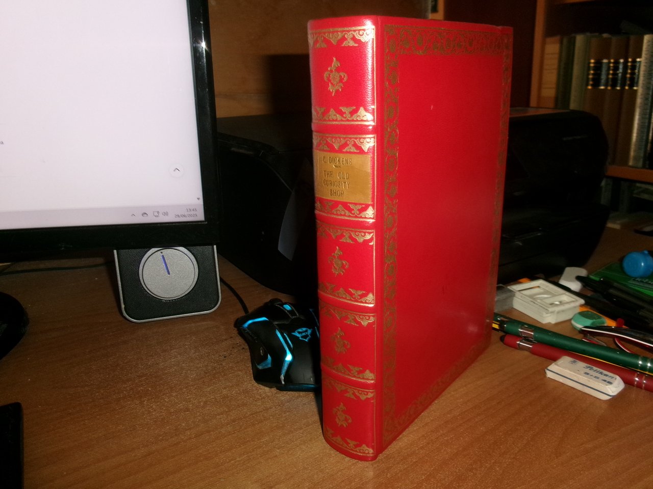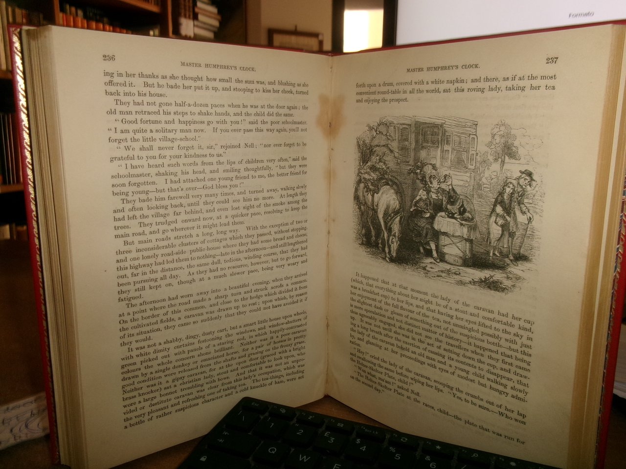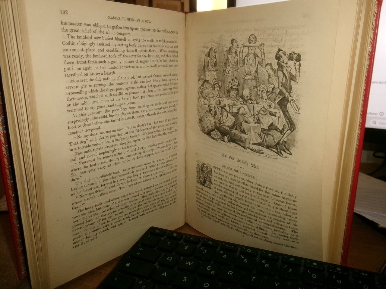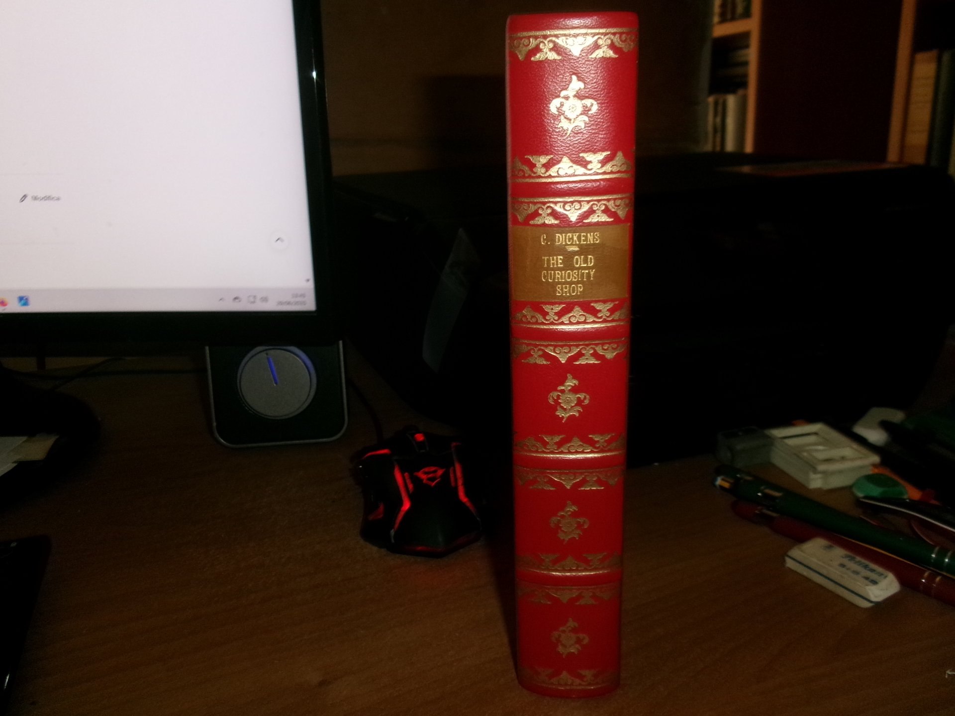 DICKENS, Charles. The Old Curiosity Shop. A tale. With illustrations by George Cattermole and Hablot K. Browne. Complete in one volume. London, Chapman and Hall, Strand, 1841. In - 8°, piena pelle rossa con bordura riquadrata sui piani impressa in oro, dorso a nervi con decorazioni auree. iv, 306, 228 pp. con numerose figure caricaturali incise in legno intercalate n.t. Rara edizione originale. His best work being for The old curiosity shop, which gave him most scope for dramatic and athmospheric effects and strong characterrisation... (Houfe, Dictionary of British book illustrators, p. 169. Neg. 7