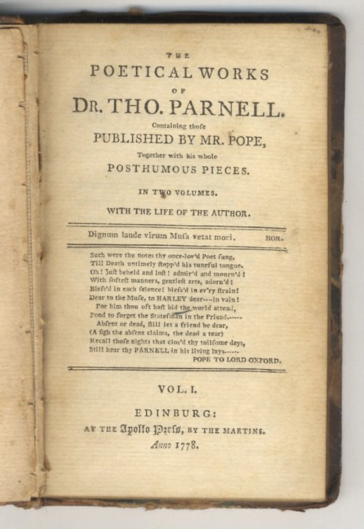 Edinburgh, At the Apollo Press, by the Martins, 1778, voll. 2, in-12, mezza pelle coeva ed angoli, tassello con titolo oro ai dorsi, piatti marmorizzati, pp. XXIV, 25-175; 179, (3). Ad ambedue i volumi: doppio frontespizio, di cui uno figurato (blanda gora), incisi in rame da Grignon su disegno di Mortimer e ritratto a medaglione in antiporta inciso da Cook. Tracce d'uso alla coperta, con piatto anteriore semistaccato al vol. 1°, ma buon interno. "Bell's Edition, The Poets of Great Britain, complete from Chaucer to Churchill".