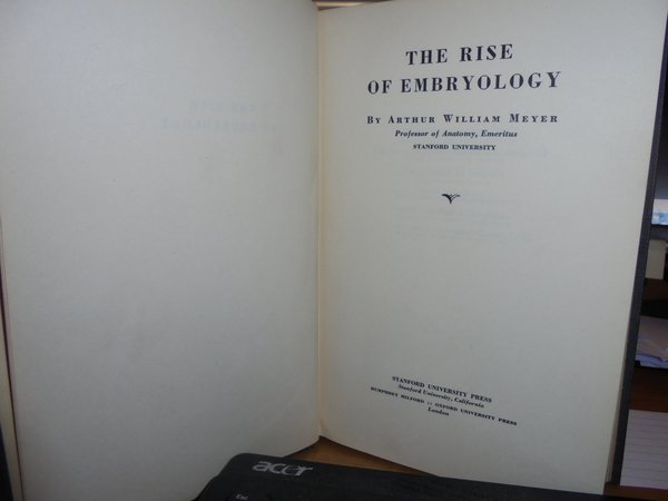 By Arthur William Meyer. London, Stanford University Press, (s.d. 1939). THE RISE OF EMBRYOLOGY. In-8° piccolo, tela bleu con titolo in oro al dorso. xv, 367 pp. con numerose illustrazioni in tavole fuori testo. Ottimo esemplare. Uff. C - IV - 4