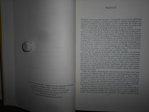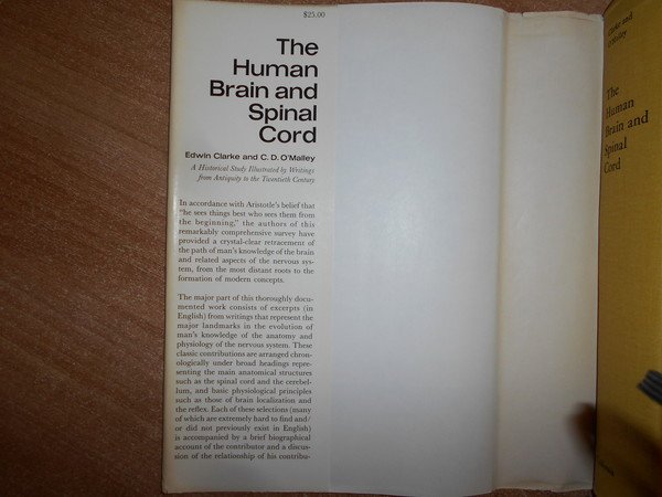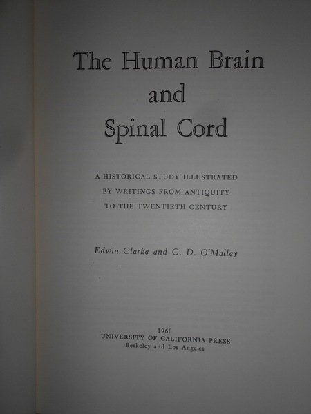 Edwin Clarke and C.D. O'Malley. Berkley and Los Angeles, University of California Press, 1968. The Uman Brain and Spinal Cord. A Historical Study illustrated by writings from antiquity to the twentieth century. In-8°, tela con sovracopertina. xiii, 926 pp. con 158 figure in tavole fuori testo stampate su carta patinata. Ottimo esemplare. Uff. C - IV - 5