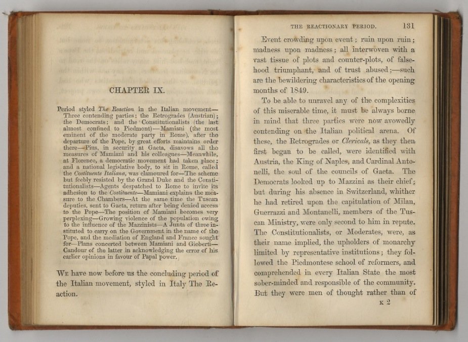 London, Routledge, Warne, and Routledge, 1859, in-16, cartone editoriale color arancione, pp. XXXII, 320. Antiporta figurata (gora marginale) con doppio ritratto (Cavour e D'Azeglio) inciso da John Alfred Vinter in litografia. Minime tracce d'usura alle cerniere dei piatti ed alle cuffie. Cartellino applicato di “Edward Goodban, Printseller & C., 4183 Via Legnaioli opposite the Cafè Doney, Florence”. L'autrice, di cui poco si conosce, salvo per la collaborazione giornalistica con C. Dickens, era all'epoca residente in Italia, come risulta dalla prefazione datata: Genova, 27-1-1859. In questo volume (uno dei 2 soli da lei scritti, entrambi dedicati alla questione italiana) raccoglie ed amplia del materiale già pubblicato sulla “British and Foreign Evangelical Review” nel 1857. Seconda edizione apparsa nello stesso anno della prima.