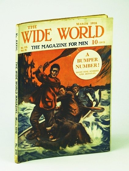 - The Wide World - The Magazine For Men, March (Mar.) 1916, No. 215, Vol. 36 - Wanderings in Northern Persia, Besieged By Cannibals vintage ads. Features: The Price of Gold -, an appalling catastrophe strikes a prosperous mining camp at, South Porcupine, Ontario, Besieged by Cannibals - a solitary man in the Congo is besieged, in his house by a mob of bloodthirsty savages, The Bull and the Barque - a bull on board a ship is worse than a, bull in a china-shop, A Bad Bargain - a young Englishmen is tricked into years of, misery on the deadly Niger coast before turning the tables on, the tricksters, The Empire's Secrets - a British soldier consents to sell plans, and photos of the defences of one of Great Britain's most, important bases in the East - before disaster overtook him, Out of the Darkness - a rash young man crosses the Rocky, Mountains alone in winter-time, Wanderings in Northern Persia (part I) - great photo-illustrated, account of a journey beginning from Enzeli, From Job to Job Around the World (part I) - two young Americans, with ten dollars between them set out to work their way around, the world, Down the Amazon from Source to Mouth (VI) - the author's, expedition fights nature and hostile natives, McGrath's Voyage - a white trader, a boy, and a pig make a wonderful 2, 000-mile trip across the South Pacific in an open boat - safely, passing through a hurricane, photo of a hot-water geyser struck by drillers in Calistoga, California Native Peoples Travel, Exploration & Adventure Magazine Back Issues