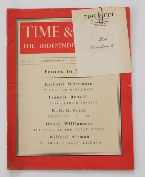'The Year of the Great Divide' [review of] James Cameron's '1914' [in] Time and Tide magazine. Vol. 2. No. 27. 7 April 1960. Vol. 40. No. 43. 24 October 1959. A SCARCE SURVIVAL