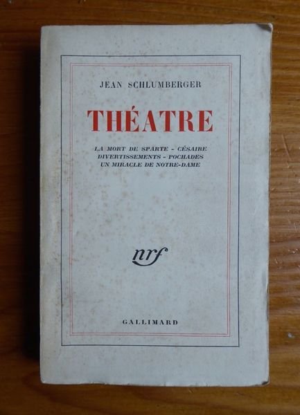 Gallimard NRF 1943. in-12. 374 pages. Gallimard NRF 1943. in-12. 374 pages. Nb de volume : 1. Usure d'usage. Dos insolé. Coiffer frottée. Rousseurs sur les plats. Ex-libris en page de garde. L?ouvrage, simplement intitulé "Théâtre", contient deux pièces, deux divertissements, deux pochades pour théâtre populaire et un miracle de Notre-Dame. Il s'ouvre sur une tragédie antique et se referme sur un "mystère" du moyen-âge. Il reprend l'essentiel du théâtre de Jean Schlumberger. Ce théâtre est varié, riche et coloré. Derrière l'apparente légèreté du propos se cache une profonde réflexion. L'érudition et l'intelligence y sont teintées d'une fine couche de subversion. L'ensemble, qui a peu vieilli, fait preuve d'une étonnante modernité. Pierre Conrad Nicolas Jean Schlumberger, né le 26 mai 1877 à Guebwiller (Haut-Rhin) et mort le 25 octobre 1968 à Paris, est un éditeur et écrivain français. Ayant choisi la nationalité française, il quitte l'Alsace en 1892 pour Paris. Il est l'un des fondateurs de La Nouvelle Revue française (NRF) en 1908 en compagnie notamment d'André Gide. Au sein de la NRF, il reste célèbre pour avoir refusé le manuscrit d'un certain Marcel Proust : À la recherche du temps perdu. Au cours de sa carrière, il reçoit le Grand prix de littérature de l'Académie française (1942), le Grand prix national des lettres (1955). Il ?uvrera toute sa vie à une entente Franco-allemande. french