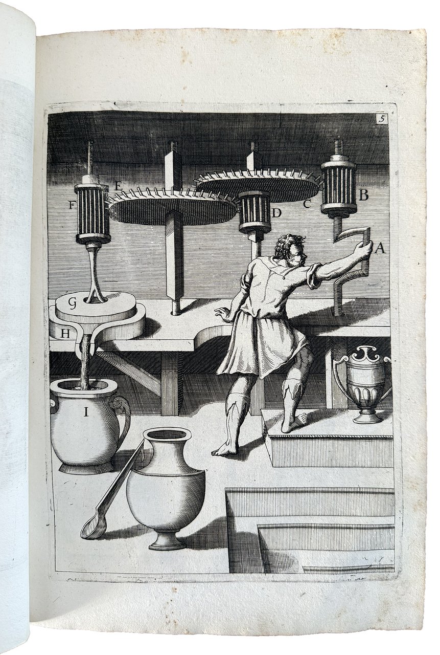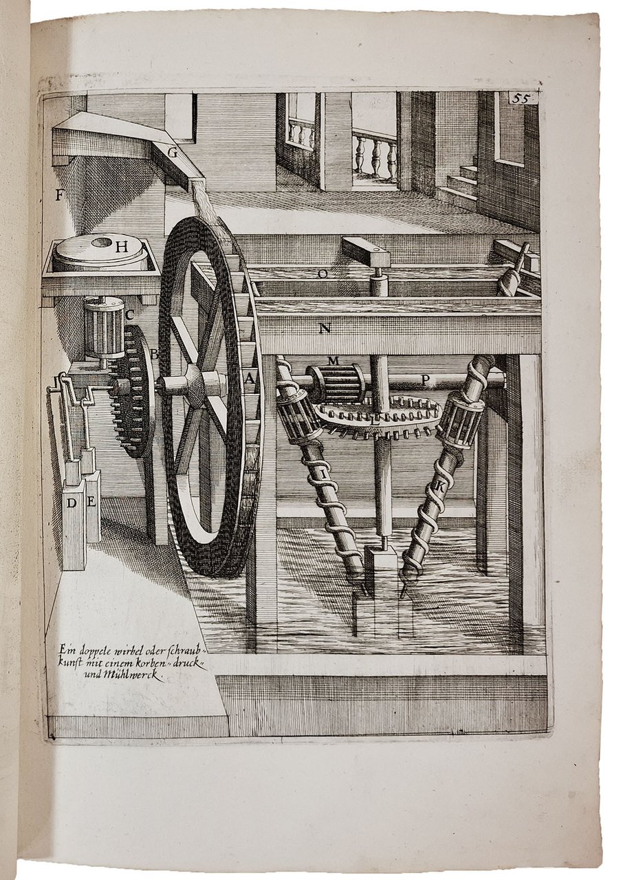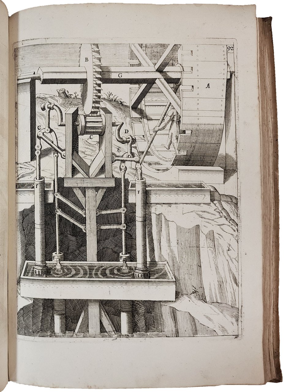 The strongly inked plates show hydraulic and mechanical machines powered by intricate systems of wheels that employ water, wind, weights, animal or human power, or some combination of these. These machines include many curious inventions applicable to all trades and human activities, such as paper and grain mills, drilling machines, roasting machines, water pumps, wood saws, blowing machines, fire engines, roasting spits, and so on.