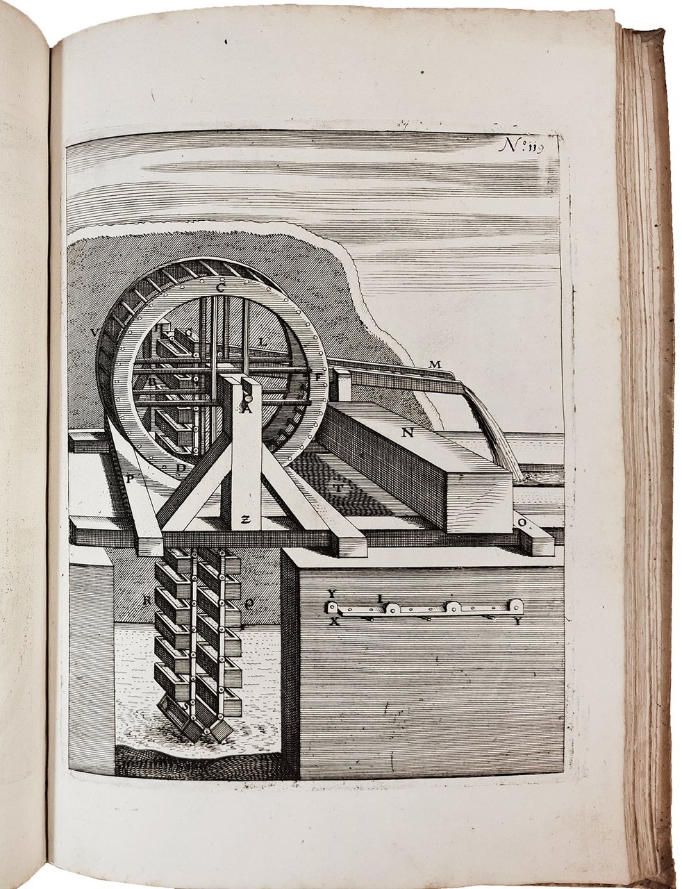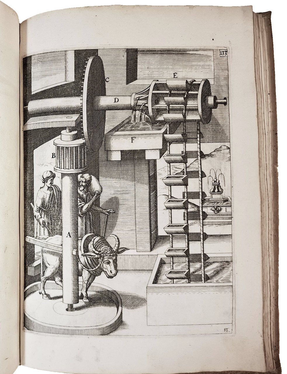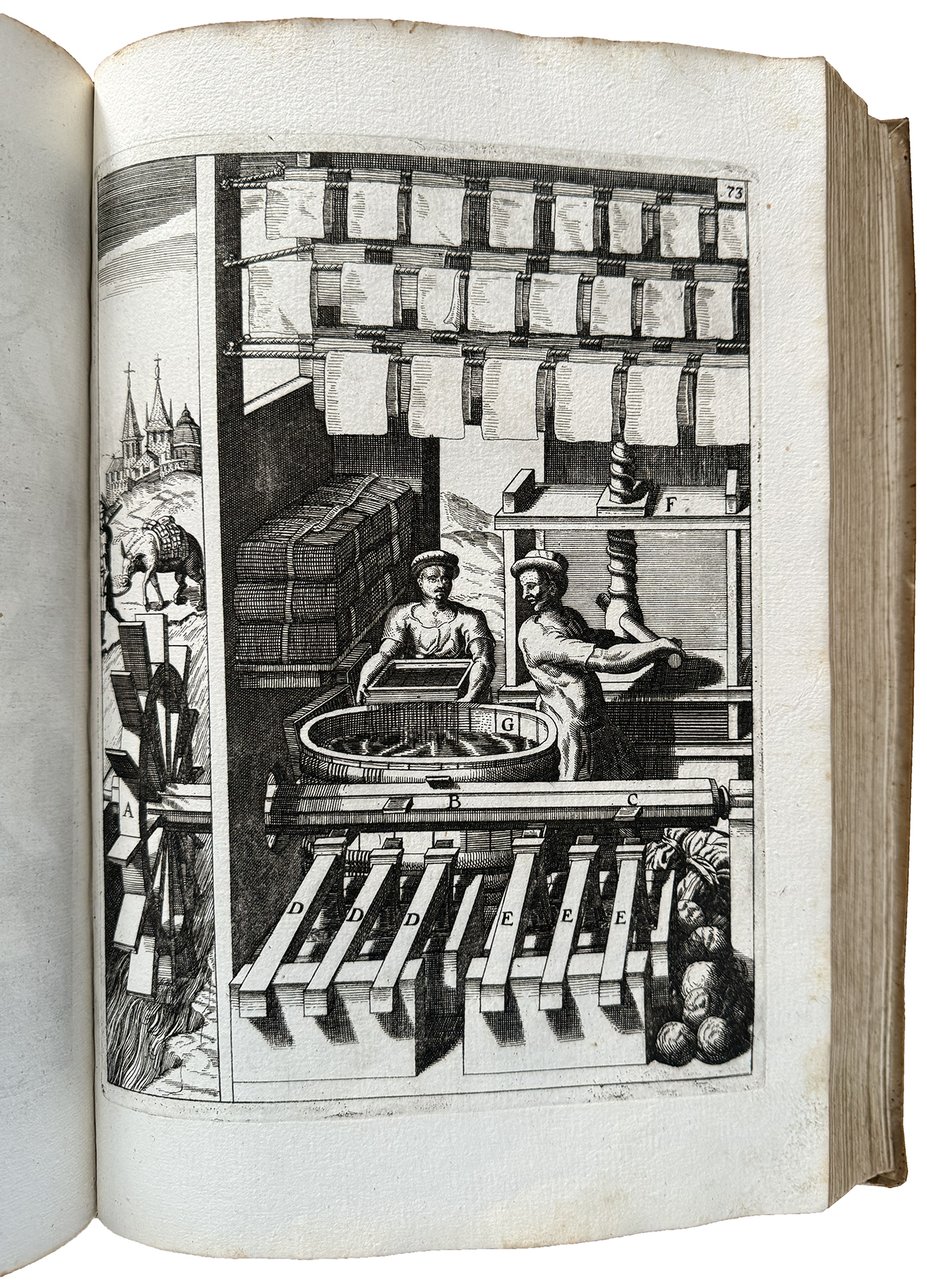 The strongly inked plates show hydraulic and mechanical machines powered by intricate systems of wheels that employ water, wind, weights, animal or human power, or some combination of these. These machines include many curious inventions applicable to all trades and human activities, such as paper and grain mills, drilling machines, roasting machines, water pumps, wood saws, blowing machines, fire engines, roasting spits, and so on.