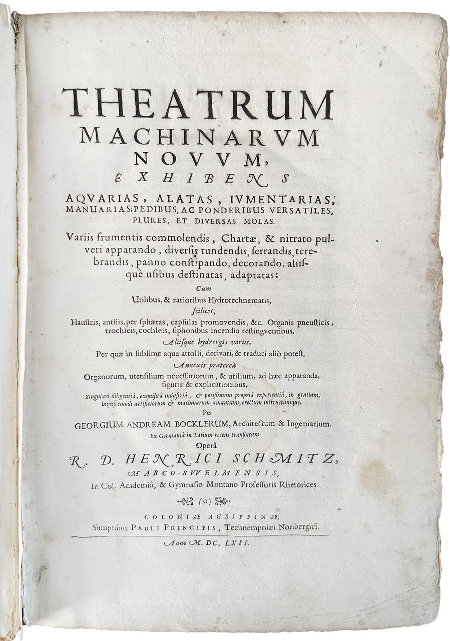 Theatrum machinarum novum, exhibens aquarias, alatas, iumentarias, manuarias; pedibus, ac ponderibus versatiles, plures, et diversas molas [...] Per Georgium Andream Bocklerum, architectum & ingeniarum. Ex Germania in Latium recens translatum opera R.D. Henrici Schmitz, [...]