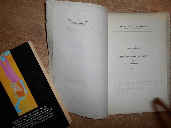 par IGNACE JEAN JOSEPH CARBONELLE (n. 1829). Belgique, Académie Royale (Extr. du t. XX n° 5 des Bullettins.), senza data. Théorie Géométrique de Parallélogramme de Watt. In-8° piccolo, br. muta 31 pp. con alcune equazioni/diagrammi n.t. Opuscolo ben conservato con dedica firmata dall' Autore nella prima bianca. Poggendorff III, p. 235.Neg. scat. rossa sephora opusc. nonn.