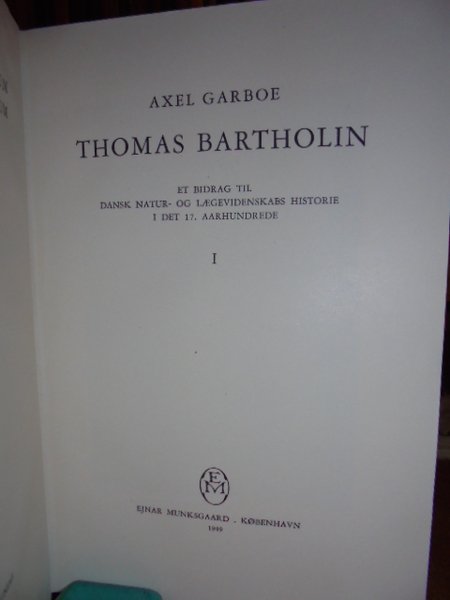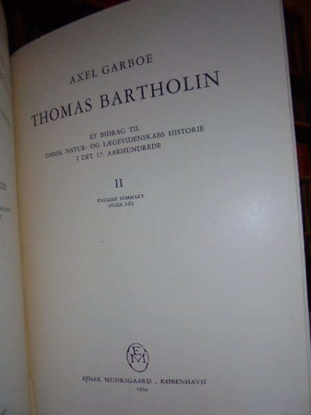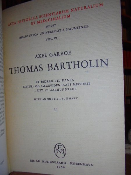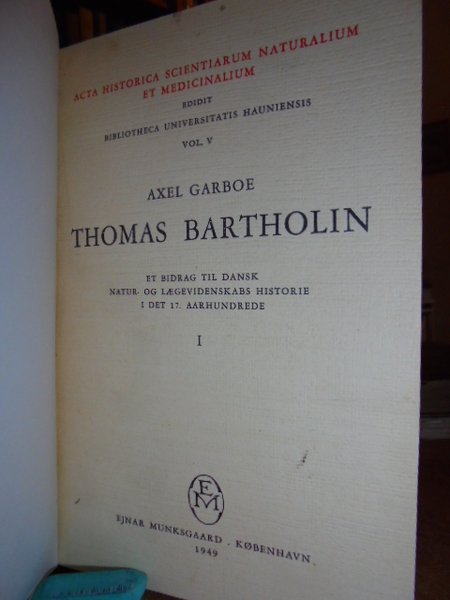 Garboe Axel - Kobenhavn, Ejnar Munksgaars, 1949. ET BIDRAG TIL DANSK NATUR. OG LAEGEVIDENENSKABS HISTORIE 1 DET 17. AARHUNDREDE. 2 VOLUMI LEGATI ASSIEME IN - 8°, TELA CON TASSELLO E TITOLO IN ORO. COPERTINE ORIGINALI CONSERVATE. IN - 8° 212 PP, 204 PP. CON IL RITRATTO DEL BARTHOLIN IN ANTIPORTA ED ALCUNE ILLUSTRAZIONI IN BIANCO E NERO N.T. IN LINGUA DANESE. OTTIMO ESEMPLARE. Neg. mob. 1