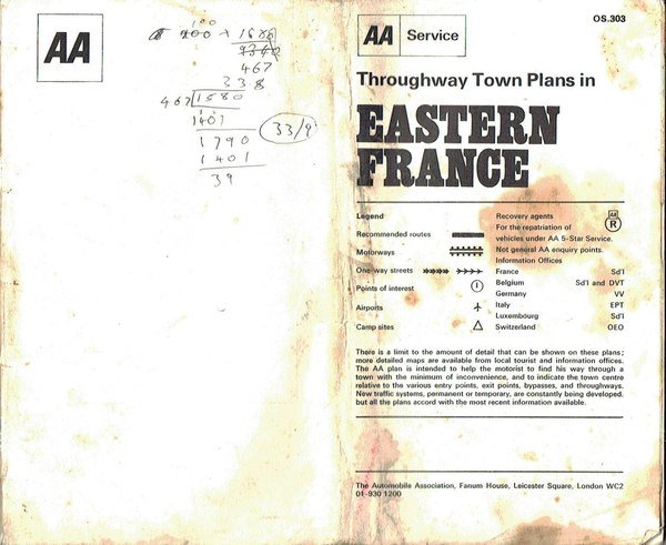 A few stains to first two pages, not affecting maps. Calculations on blank part of cover. Has been stored folded in two. 40pp. With 66 town plans from Abbeville to Vichy plus 3 district through routes. A fascinating reminder of the pre-satnav days.
