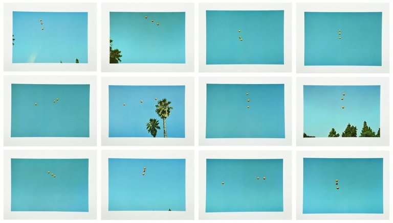 Una delle più note realizzazioni dell’artista americano John Baldessari (1931-2020). Per quest’opera Baldessari lanciò tre palline contemporaneamente, cercando di allinearle a mezz’aria, mentre sua moglie, Carol Wixom, scattava delle fotografie. Sebbene si sforzasse di rendere ogni tentativo identico, nessuna immagine risulta uguale all’altra a causa delle inevitabili differenze nella sua tecnica e di variabili incontrollabili, come i cambiamenti nella velocità del vento. Baldessari effettuò trentasei tentativi — pari al numero di scatti di un rullino standard da 35 mm — e scelse le dodici fotografie che considerava più riuscite. Attraverso questo processo, documentò l’incolmabile divario tra l’ideazione di un concetto artistico e la sua esecuzione, inevitabilmente influenzata dalle incidenze del caso. Edizione originale di 2000 copie.