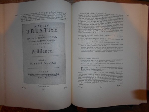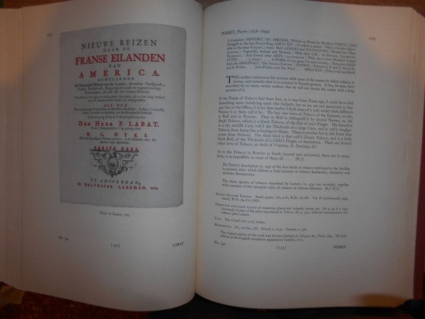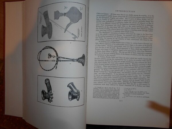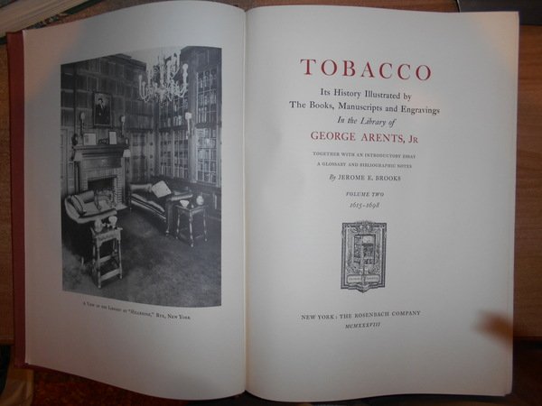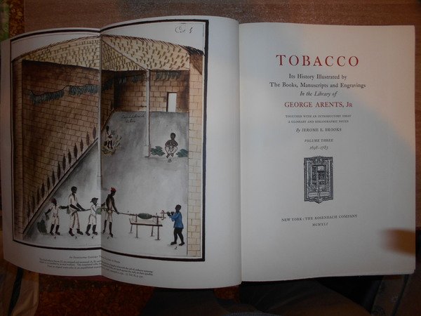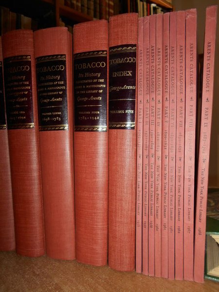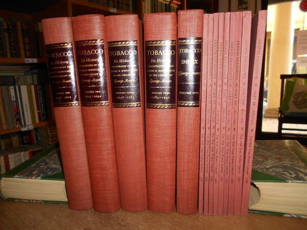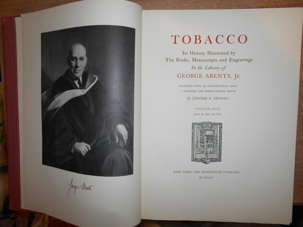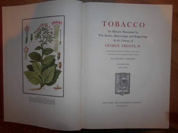 JEROME E. BROOKS. New York, The Rosenbach Company, 1937/1952. TOBACCO Its History Illustrated by The Books, Manuscripts and Engravings in The Library of GEORGE ARENTS, JR Together with an Introductory essay a glossary and Bibliographic notes. Opera completa in 15 volumi, (5 volumi sono in tela con titoli in oro entro tasselli ai dorsi), 10 volumi sono in brossura originale. Volume one 1507-1615. xxi, 543 pp.; Volume two 1615-1698. 564 pp.; Volume three 1698-1783. 545 pp.; Volume four 1784-1942. 485 pp. con a synoptical chart illustrating the chef division of the History of Tobacco più volte ripiegata inserita nella apposita tasca alla fine del volume.; Volume five. Index by Anne M. Nill. 327 pp.; L' opera è corredata da innumerevoli illustrazioni la maggior parte in bianco e nero. Edizione numerata (n° 153). 10 parti in-folio in brossura orig. compiled by Sarah Augusta Dickson. New York, Public Library, 1958/1968. Complessive 565 pp. con innumerevoli illustrazioni anche a piena pagina fuori testo. Il decimo volume non è in fotografia ma è nell' opera in vendita. In perfetto stato di conservazione. L' opera si vende solo in Italia. Uff. D - II - 6.