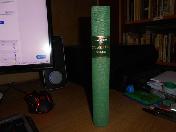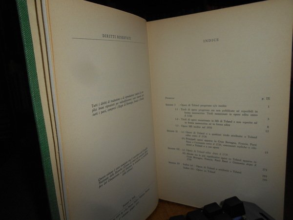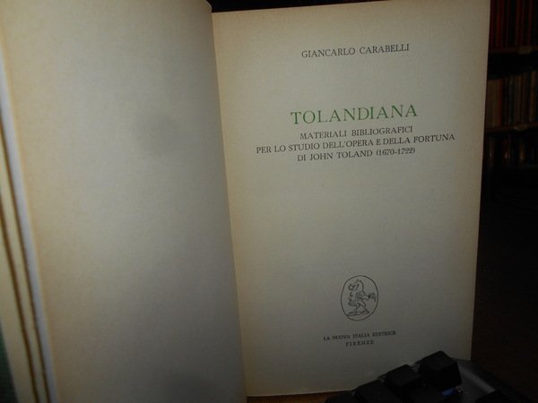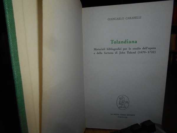 Giancarlo Carabelli. Firenze, La Nuova Italia Editrice, 1975. TOLANDIANA. Materiali Bibliografici per lo studio dell' Opera e della fortuna do John Toland (1670 - 1722). In-8°, tela verde con titolo in oro entro tassello al dorso, copertine originali conservate. xii, 407, (1) pp. Perfetto esemplare in legatura artigianale con le copertine originali conservate. Uff. C - I - 1