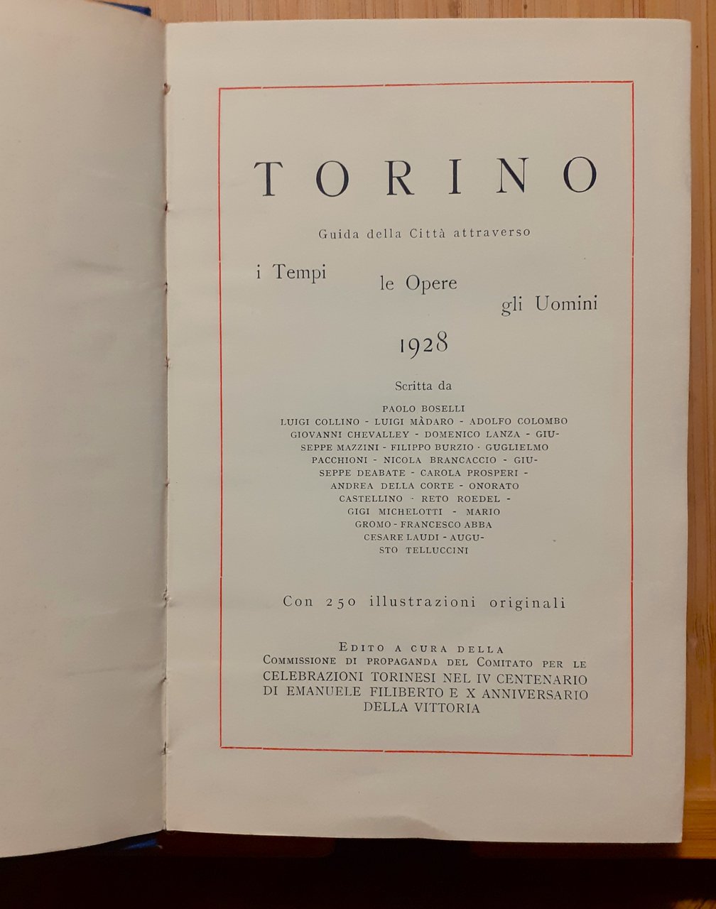 I ed. della guida della Città di Torino edita in occasione del IV Centenario di Emanuele Filiberto e X Anniversario della Vittoria. In-16, pp. IV+636, rilegatura in tela blu cerata con titoli color oro al piatto e al dorso. Testo della guida stampato entro cornice semplice rossa; con numerose illustrazioni in b/n da fotografie e disegni e con una pianta di Torino a colori ripiegata in scala 1:12.500 e con elenco delle vie etc., custodita entro apposita tasca editoriale in terza di copertina. La cartina è a cura della Soc. An. "L'Antonelliana", via Cittadella, 4 Torino (stampa: Torino, Vincenzo Bona). Stato buono (lieve stato d'uso della copertina - pagine lievemente ingiallite, ultimo foglio di guardia con due strappi paralleli che partono dal margine esterno: il superiore lungo 3,5 ca ca. e l'inferiore lungo 6 cm ca.). Indice del testo: Paolo Boselli; Torino - Luigi Collino; Torino vecchia e Torino nuova - Luigi Màdaro (Direttore della Biblioteca Civica); La storia: dalle origini al dominio Napoleonico - Adolfo Colombo (Direttore del Museo del Risorgimento italiano); La storia: il Risorgimento - Giovanni Chevalley e Aless. Protto; Torino e l'architettura - Domenico Lanza; Torino letteraria - Giuseppe Mazzini (Deputato al Parlamento); La città che lavora - Filippo Burzio (Professore alla R. Scuola d'Ingegneria); La scienza - Guglielmo Pacchioni (Direttore della Regia Pinacoteca); Gallerie d'arte e Musei - Nicola Brancaccio (Principe di Ruffano, Direttore della R. Biblioteca e Medaliere); Ricordi di storia militare - Giuseppe Deabate; La maschera di Torino - Carola Prosperi; La donna torinese - Annibale Pastore (Professore nella R. Università di Torino); Il pensiero filosofico nel Piemonte - Andrea Della Corte (Professore nel Liceo Musicale di Torino); La musica e i musicisti - Onorato Castellino; Poesia dialettale - Reto Roedel, Chiese - Alessandro Protto; Viali e giardini - Gigi Michelotti; I Teatri di Torino e i Torinesi a teatro - Mario Gromo; Caffè - Francesco Abba (Medico Capo, Ufficiale Sanitario di Torino); Sanità, igiene ed assistenza - Cesare Laudi; La città che studia - Augusto Telluccini; I dintorni - La città di oggi: notizie per chi visita - Indice delle illustrazioni.