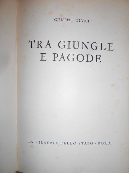 TUCCI, GIUSEPPE. Roma, La Libreria dello Stato, 1953. TRA GIUNGLE E PAGODE. In-8°, br. orig. 152 pp. con 47 tavole di cui 1 ripiegata fuori testo. Copertine con normali segni del tempo ma in ottimo stato di conservazione. Uff. stanz,. TV mob. nostro