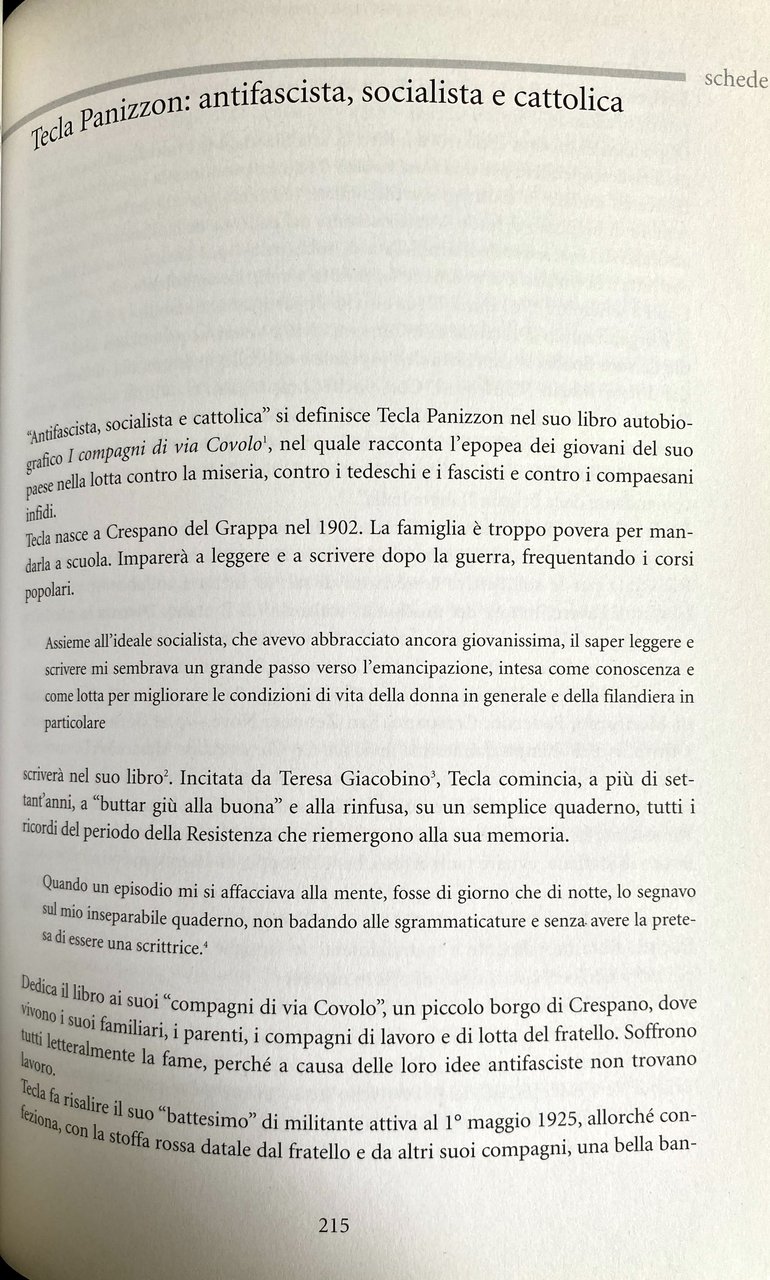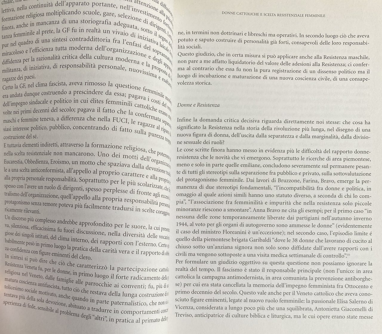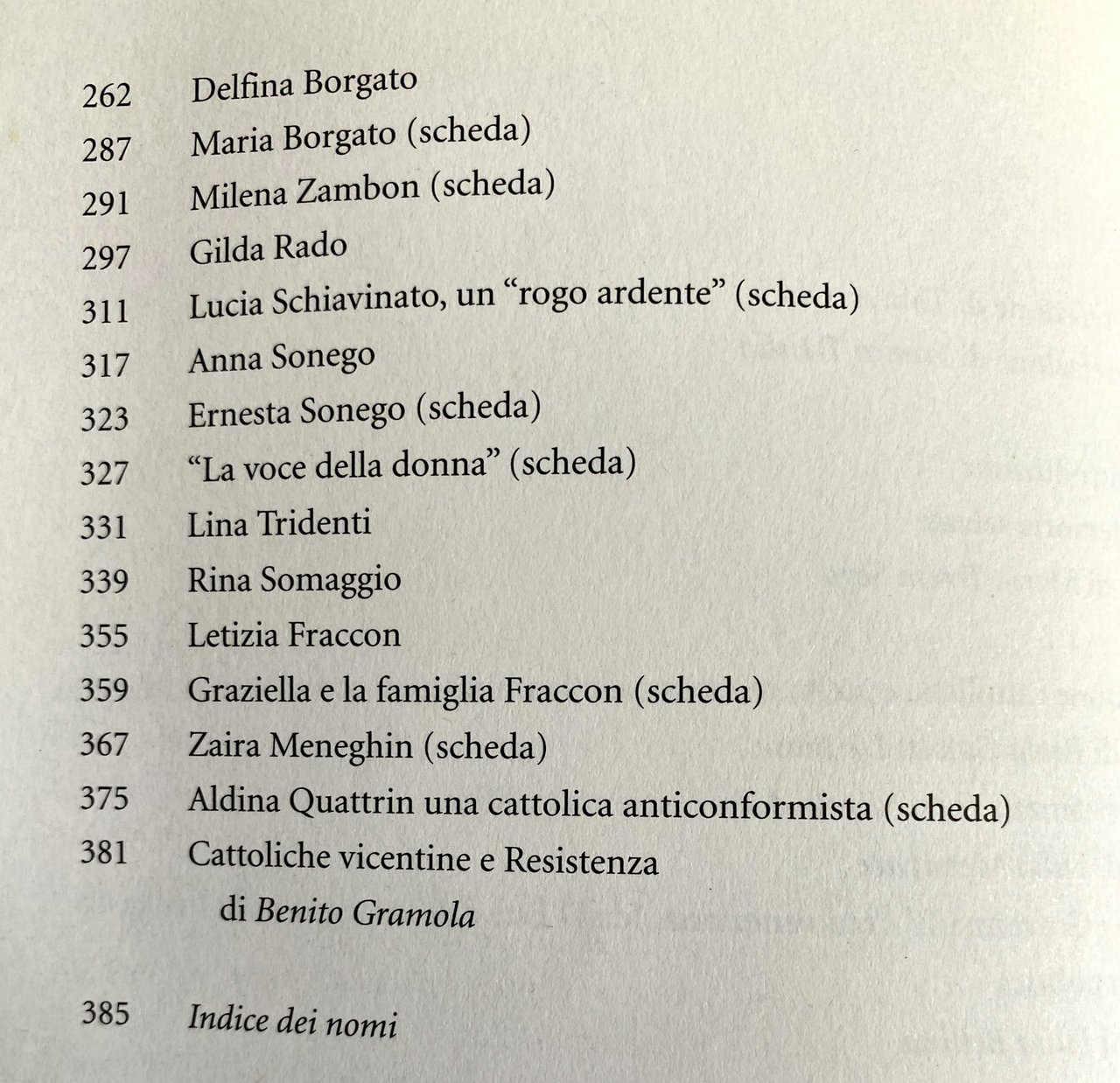 Soggetti: Storia contemporanea di genere Resistenza Partigiani Liberazione Staffette Alleati Altipiano Sette Comuni Memoria Testimonianze Libertà Donne cattoliche Coscienza Ida D'Este Impegno civile Militanza Nazifascismo Tedeschi Germania Occupazione Fascismo Nazismo Oppositori Antifascismo Ginetta Ponti Biografie Lavoratrici Raggi d'ambiente Elisa Perini Crocerossine Partigiane Marcella Dallan Sara Rapisarda Bruna Carazzolo Rossana Vedana Tecla Panizzon Socialisti Comunismo Chiesa Teresa Lidia Liliana Martini Delfina Maria Borgato Milena Zambon Gilda Rado Lucia Schiavinato Ernesta Sonego Lina Tridenti Rina Somaggio Letizia Fraccon Graziella Famiglie Aldina Quattrin Anticonformismo Vicentine Veneziane Brigate Garibaldi Ruoli Sostegno Salvezza Prigionieri Militare Radio Informazione Territorio Ordini Uccidere Attentati Capi Partecipazione Lettere Corrispondenza Uomini Condannati a morte Montagne Armi Banditi ACLI Antifascisti Arresti Azione Cattolica Belluno Bicicletta Bolzano Carcere Carità Castelfranco Veneto Cisl Clandestinità Democrazia cristiana Diocesi Dirigenti Domenico Sartor Ebrei Leggi razziali Antisemitismo Persecuzioni Fabbrica Famiglia Fascisti Figli Giovani Giovanni Ponti Gramola Guerra Interviste 8 settembre Lager Lotta Maritain Mauthausen Meneghetti Operaie Deportazioni Campi concentramento Organizzazioni Padova Padre Cortese Palazzo Giusti Piave Politica Prigionieri Ragazze Saonara Scelta Scuola Sonego Staffetta Torture Vicenza Vittorio Collezionismo Saggi Libri illustrati rari fuori catalogo Popolare Non-violenza Laici Comunisti Giustizia sociale Religiosità Università Insegnanti Marchesi Bobbio Valgimigli Formazione cattolica FUCI Gioventù femminile Papa Paolo VI Studium Montini Autonomia Iniziativa Fede Adesione Imprigionamento Torture Deportazione Scritti Mounier Vocazione Martirio Vescovi Responsabilità Cattolicesimo Femminismo cristiano Ermes Farina Amici Attività Bassano Brigata Canonica Caserma Chilesotti Comandante Formazioni partigiane Fucilazione Fucini Prandina Massignan Soldà Giovane Italia Grappa Gruppo Mariano Rumor Marostica Masaccio Monte Berico Neri Pozza Bressan Parroco Pianezze Rastrellamenti Resistenziale Rovigo Sabotaggi Thiene Giuriolo Valdagno Valli Pasubio Yad Vashem Zaira Giorgio la Pira Sturzo Aldo Moro Pèguy Solidarietà Rebershak Movimento cattolico CLN Combattenti Martiri Vita quotidiana Protagonisti Scoppola Rossi Doria Tramontin 25 Aprile Maria Montessori Cesare Battisti Volontari CISL ANPI Croce Rossa Curiel Bombardamenti Memorie Contemporary history of gender Resistance Partisans Liberation Couriers Allies Plateau Memory Testimonies Freedom Catholic women Consciousness Venice Civil commitment Militancy Nazi-fascism Germans Germany Occupation Fascism Opponents Anti-fascism Biographies Workers Red Cross nurses Partisans Socialists Communism Church Brigades Support Salvation Prisoners Attacks Participation Letters Correspondence Sentenced to death Mountains Weapons Bandits Catholic Action Clandestinity Jews Racial laws Anti-Semitism Persecutions War Interviews Struggle Workers Deportations Concentration camps Politics Prisoners Girls School Torture Essays Rare illustrated books out of print Popular Non-violence Lay Communists Social justice Religiosity Catholic education Female youth Deportation Writings Catholicism Feminism Partisan formations Shootings Roundups Sabotage Catholic movement Fighters Martyrs Daily life Protagonists Volunteers Bombings Memories