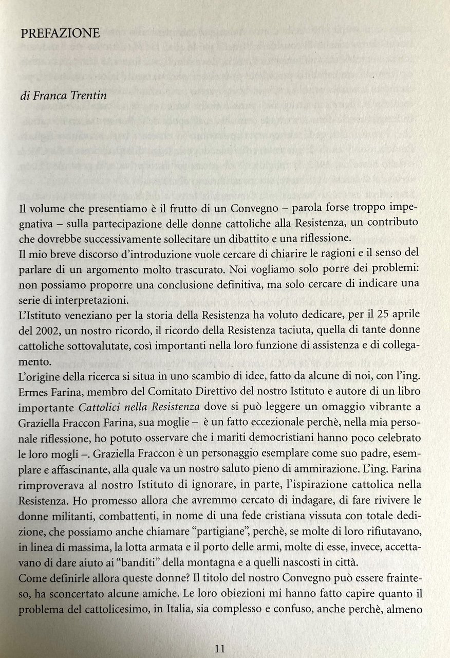 La Resistenza delle donne cattoliche è stata a lungo doppiamente taciuta: dalla storiografia e dalla memoria collettiva. Il libro, che raccoglie gli atti di un convegno a loro dedicato nel 2002 e rende pubbliche le testimonianze di alcune protagoniste, colma, almeno in parte, questo silenzio, offrendo alla storia dell'antifascismo, della lotta di Liberazione e del dopoguerra in Veneto nuovi spunti di interpretazione ed una visione più complessa delle motivazioni che spinsero molte donne ad un impegno militante che ha trovato, per alcune, continuità nella politica.