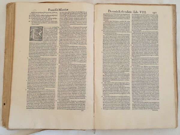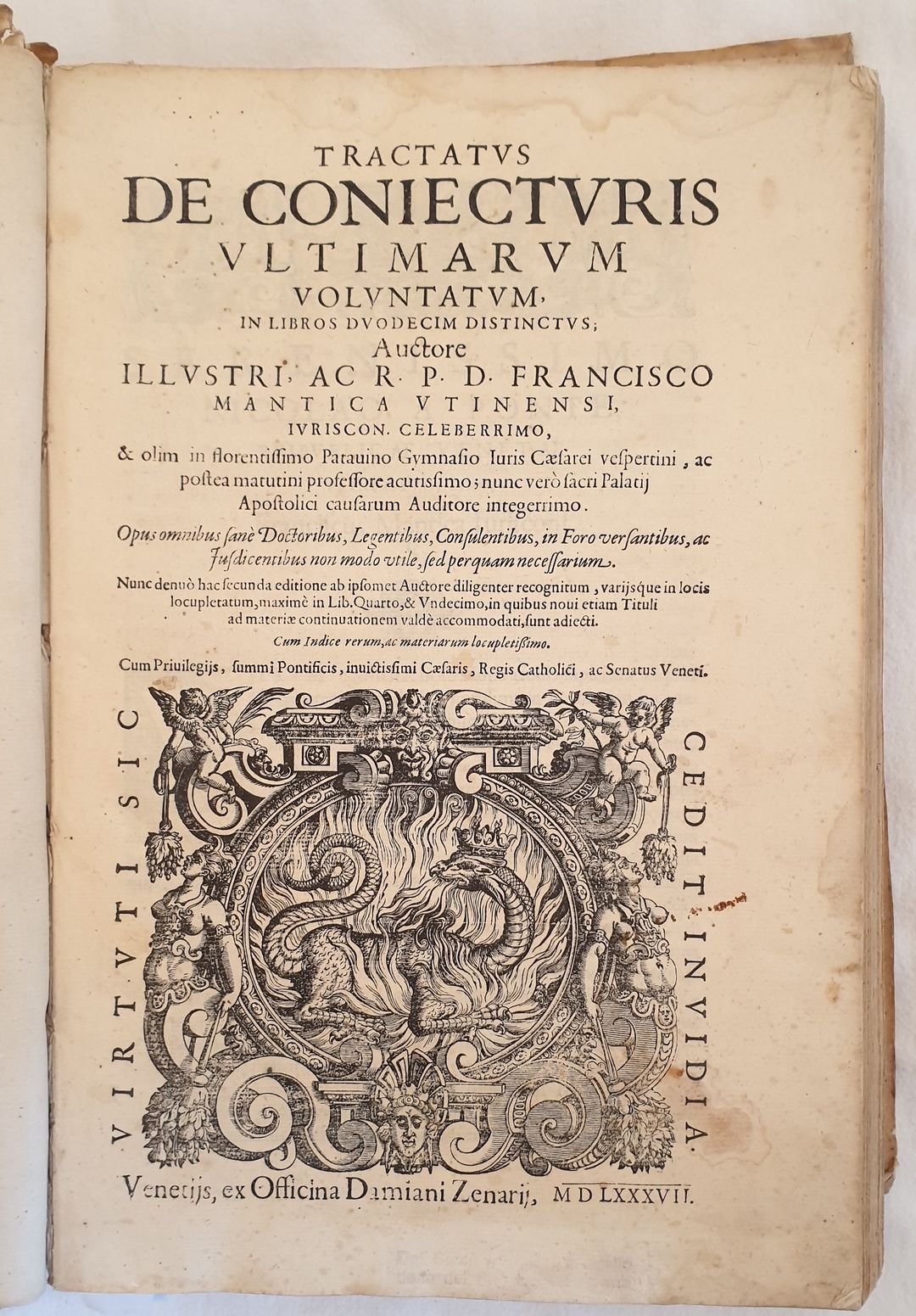 Bella edizione del 1587 di questa celebre opera di diritto del cardinale e giurista Francesco Mantica (1534-1614). Questa è la sua opera più celebre, la più studiata tra il 1500 e 1600. E' un trattato sull'applicazione della interpretatio e delle sue categorie ai negozi e tra questi al testamento. Bella marca editoriale al frontespizio e lettere iniziali decorate. Testo a doppia colonna. Numerazione singola. Antiche note manoscritte. In discrete condizioni ma completo. Copertina in piena pergamena coeva in mediocri condizioni con usure e parti mancanti ai margini e dorso mancante. Piatti staccati. Legatura in buone condizioni. Pagine in buone condizioni con fioriture. In 4. Dim. 36x25x7 cm. Pp. (6)+399+(36). Peso Kg. 2,700 Beautiful edition of 1587 of this famous work of right by the cardinal and jurist Francesco Mantica (1534-1614). This is his famous work, the most studied between 1500 and 1600. It is a treaty about the application of interpretatio and of its categories to shops and between the Testament. Beautiful editorial mark in the title page and decorated capital letters. Text in double column. Single numbering. Antique handwritten notes. In fair conditions but complete. Full parchment coeval cover in poor conditions with wearings and losses in the edges and spine lacks. Plates are detached. Binding in good conditions. Pages in good conditions with foxing. In 4. Dim. 36x25x7 cm. Pp. (6)+399+(36). Peso Kg. 2,700