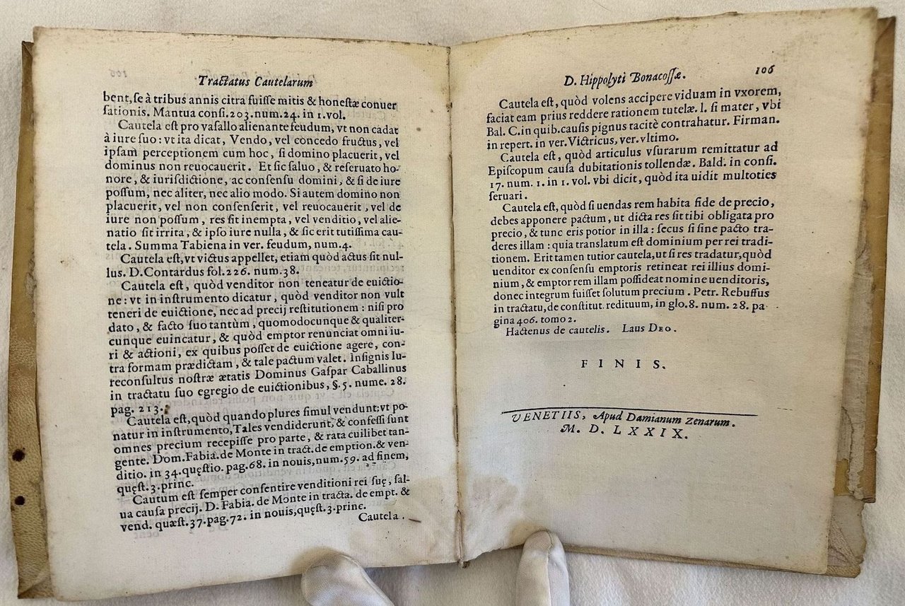 Edizione del 1579 di questo trattato di diritto cautelare del giuresconsulto ferrarese Ippolito Bonacossa (1514-1591). Antiche note manoscritte al frontespizio e ai margini. Bella marca editoriale "Salamandra incoronata, tra fiamme. Motto: Virtuti sic cedit invidia". Numerazione singola. In buone condizioni. Copertina in pergamena molle coeva con titolo manoscritto al dorso in buone condizioni generali con lievi usure ai margini e dorso. Legatura in discrete condizioni con lievi rotture e corpo del libro staccato dalla copertina. Pagine in buone condizioni con rare fioriture. In 8. cm 20,5x16. Pp. (8)+106+(1).Edition of 1579 of this treaty about the juresconsult from Ferrara Ippolito Bonacossa (1514-1591). Antique handwritten notes in the title pages and edges. Beautiful editorial mark "Salamandra incoronata, tra fiamme. Motto: Virtuti sic cedit invidia". Single numbering. In good conditions. Parchment coeval cover with handwritten title in the spine in good conditions lightly worn in the extremities. Binding in fair conditions with light cracks and body of the book detached form the cover. Pages in good conditions with occasional foxing. In 8. cm 20,5x16. Pp. (8)+106+(1).
