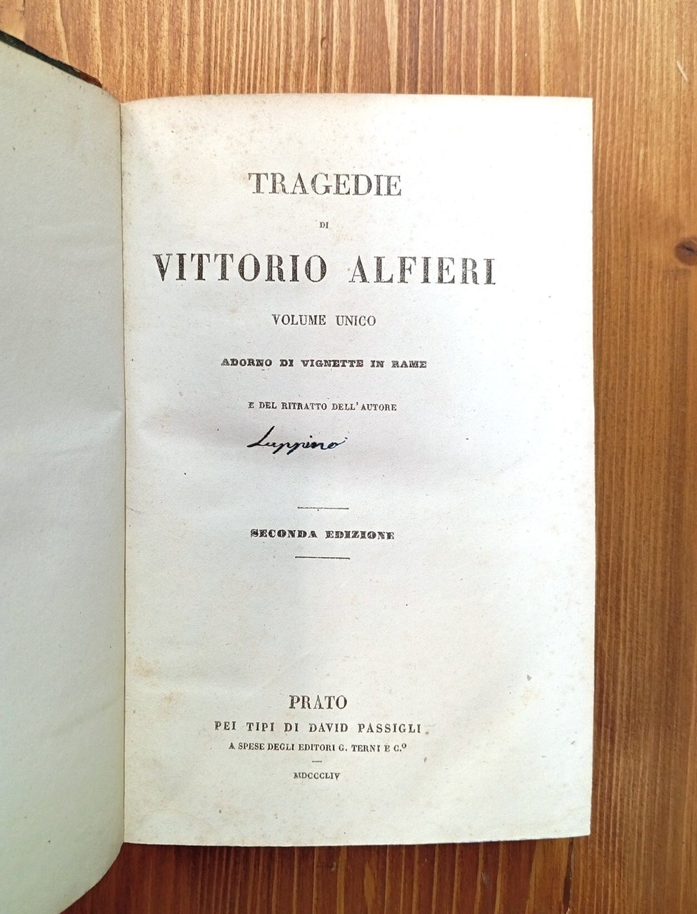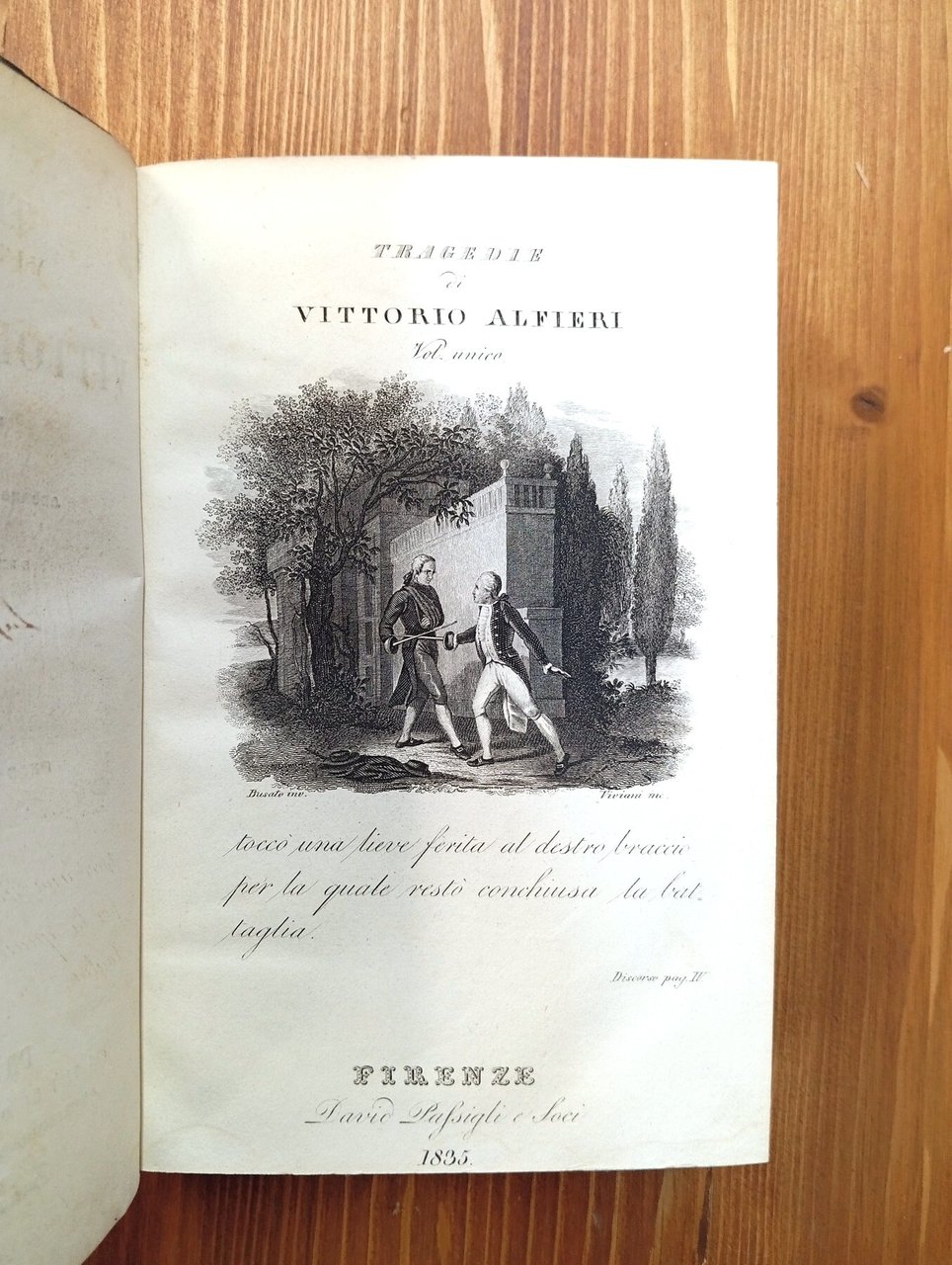 Volume unico - Tomo rilegato in mezza pelle con titolo in oro al dorso, XXIV-494 pagine; con un Discorso su la vita e le opere di Vittorio Alfieri di Pietro Dal Rio. Una bella tavola incisa in apertura, mancano quelle intercalate. Testo in corpo piccolo e stampato su due colonne. Ordinarie fioriture alle carte, ma esemplare in buone-ottime condizioni complessive.