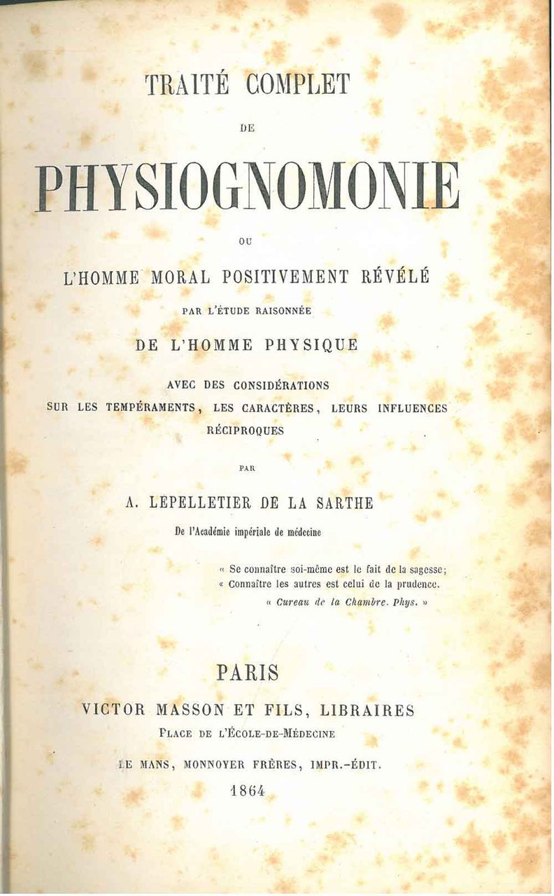 Traité complet de physiognomonie ou l'homme moral positivement révélé par l'etude raisonnée de l'homme physique avec des considérations sur les tempéraments, les caractères, leurs influences réciproques