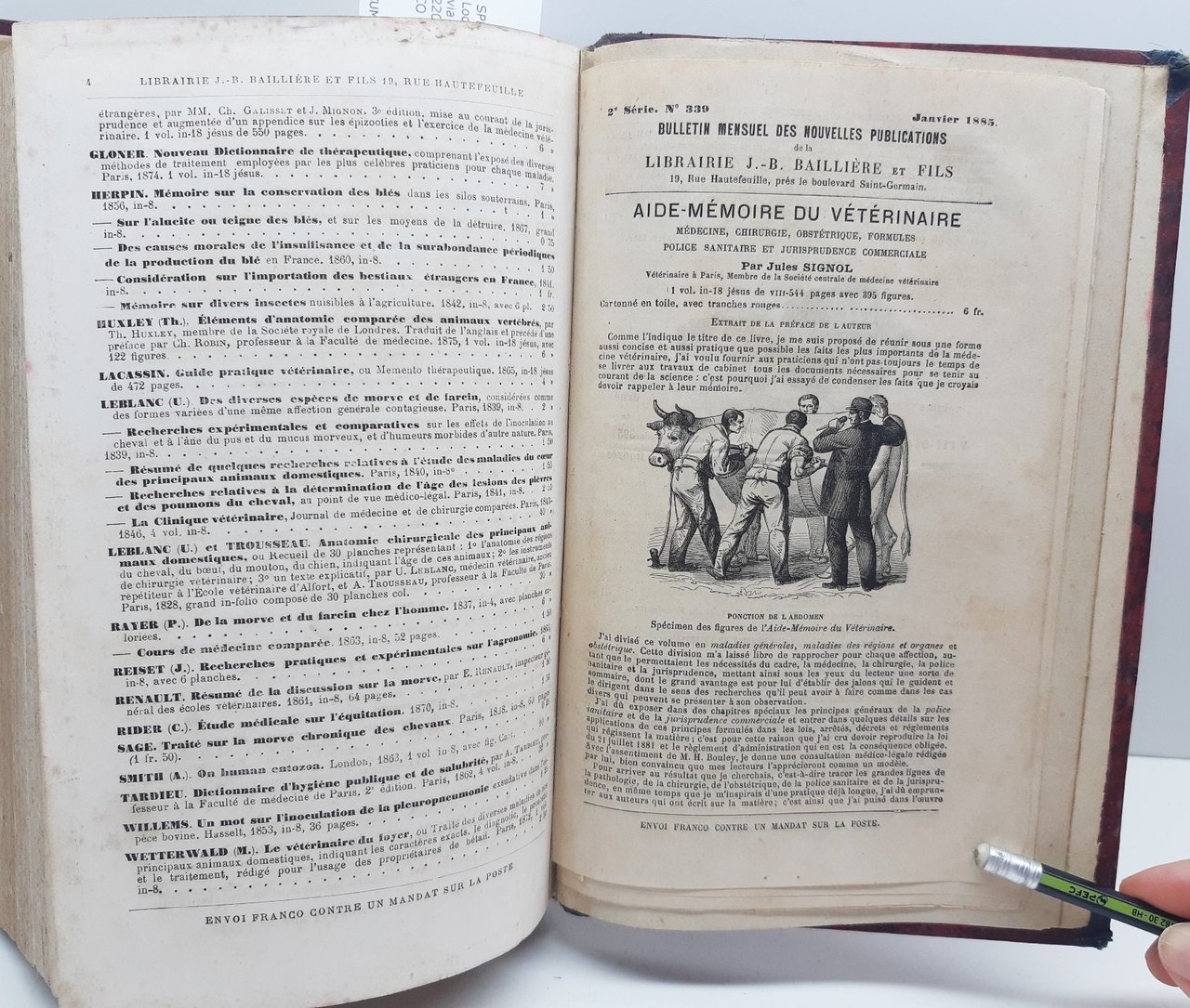 legatura rigida in mezza pelle con piatti marmorizzati e dorso in pelle, in condizioni accettabili alcune abrasioni e segni del tempo ai piatti, dorso con abrasioni e segni di usura, etichetta di catalogazione e titolo appena visibile, tagli bruniti impolverati quelli superiori, alla seconda di copertina ex-libris, timbro di possesso alle prime tre pagine, fioriture diffuse alle pagine interne, in francese, alcune pagine leggermente brunite, vedere immagini, numerose immagini nel testo, all'interno Bullettin mensuel numero 167 del 1878 Dictionnaire des mÈdecine de chirurgie ed D'HygiËne vÈtÈrinaires n. 339 del 1885 numero pagine 1036 + 4 + 15 dimensioni cm 25 x 17 x 5,5