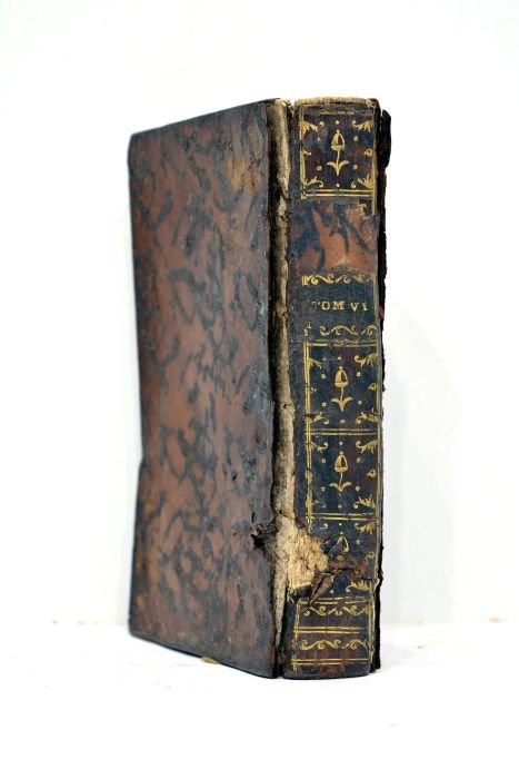 Tome 6 seul. VI. 435 pages. (17x10,5cm). Pleine basane du temps marron foncé. Dos lisse orné et titré en lettres dorées. Filet doré sur les coupes. Tranches marbrées. Gardes de papier marbré. Manque de cuir sur le dos. Pièce de titre manquante. Accdient à la coiffe supérieure. Charnières fendues. Cuir partiellement décollé des plats au niveau des mors. Taches et frottements sur les plats. Exemplaire un peu déformé. Intérieur abîmé par l'humidité. Mouillures affectant l'ensemble de l'ouvrage. Quelques taches et rousseurs sans gravité. Quelques défauts d'usage. Pleine basane du temps qui mérite une grande restauration.