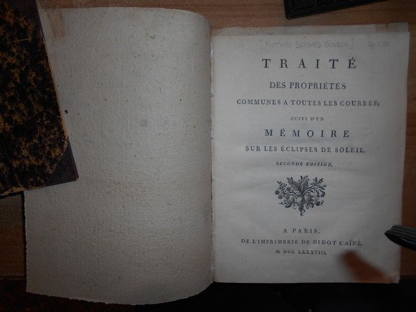 Traité des propriétés communes à toutes les courbes suivi d' un Mémoire sur les éclipses de soleil. Seconde édition. (GOUDIN, Matthieu-Bernard, 1734-1817). Paris, Didot l' Ainé. 1788. In- 4°, br., cop. muta in carta antica. 86, (5) pp. e 1 tavola incisa in rame f.t. Poggendorff, I, 932. Lalande, Bibliographie astronomique, p. 608. Ottimo esemplare. Neg. mob. 8 entro busta trasp.