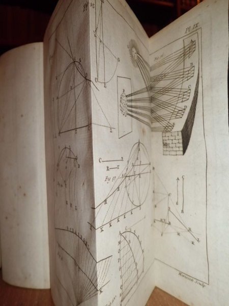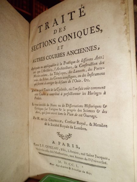 Traité des sections coniques, et autres courbes anciennes, Appliquées ou appliquables à la Pratique de différens arts, tels que l'Artillerie, l'Architecture, la Construction des Miroirs ardens, des Téléscopes, des lunettes, des Porte - voix, des Echos, des Cornets acoustiques, ou des instruments qui servent à corriger les défauts de l'Ouïe, etc. Avec un petit Traité de la Cycloïde, où l'on fait voir comment cette Courbe a contribué à perfectionner les Horloges à Pendule. LA CHAPELLE, Abbé Jean - Baptiste de. Paris, J.F. Quillau, 1750. Edizione originale. In - 8°, cartone coevo con titolo impresso sul dorso. iv, xxi, xvi, 330, (4) pp. con 10 tavole più volte ripiegate f.t. Ben conservato.