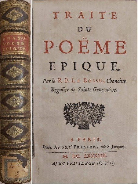 in-16, pp. (10), 420, leg. t. pelle con nervi, tassello e fregi in oro al d. Tagli dec. Bell’antip. inc. in rame raff. figg. allegoriche. Interessante trattato sulla natura del poema epico e sulla favola, in cui ci si sofferma sulla narrazione, azione, sull’uso del “deux ex machina”, sulle espressioni e sentenze ricorrenti. Ricco di note in latino e greco ai margini. Macchia ai tagli sup. ma intatto il testo. Bell’esempl. Manca al Graesse. Brunet, VI, 12229 cita l’ediz. del 1714. [261-2]