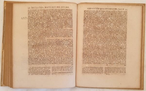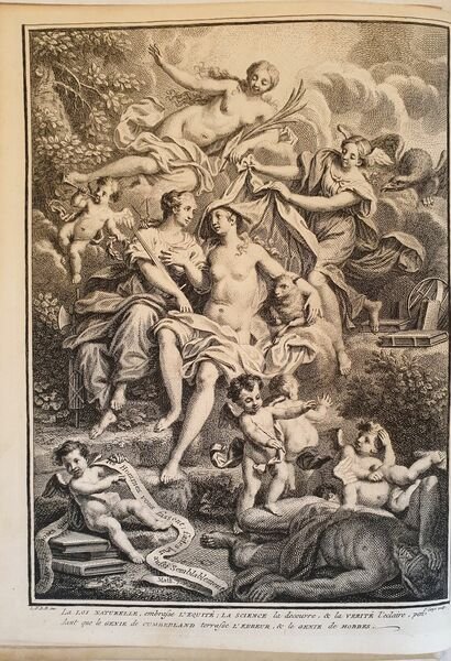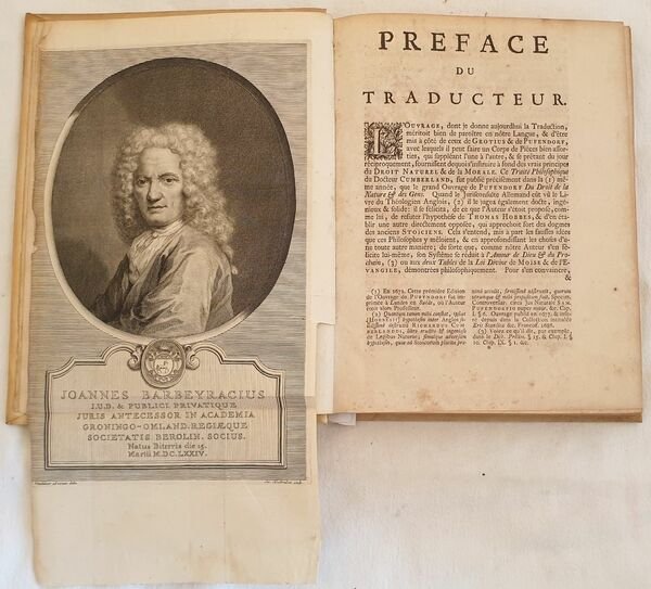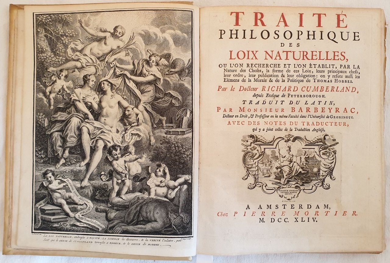 Prima edizione francese del 1744 di questa celebre opera del filosofo inglese e vescovo di Peterborough Richard Cumberland (1631-1718). Traduzione dal latino a cura di Monsieur Barbeyrac. Questa è la sua opera più importante nella quale confuta le teorie di Hobbes atto fondatore dell'utilitarismo e una delle fonti del diritto naturale. incisione allegorica in antiporta incisa da Pierre Tanjé su disegno di Louis Fabrice du Bourg. Ritratto del traduttore Jean du Barbeyrac. In buone condizioni e completo. Copertina in piena pergamena con titolo e decorazioni in oro al dorso in ottime condizioni generali con lievi usure ai margini e dorso. Legatura in buone condizioni. Pagine in buone condizioni con fioriture e bruniture. In 8. Dim. 26x21 cm. Pp. XXVIII+(2)+435+(9). Kg. 1,139. First French translation of 1744 of this philosophical work byt he english phylosopher and byshop of Peterborough Richard Cumberland (1631-1718). Translation from latin by Monsieur Barbeyrac. This work examines the laws of nature according to Cumberland. This was his major work, which propounds utilitarianism and opposes the egoistic ethics of Thomas Hobbes. In very good conditions. Parchment coeval cover with golden decorations and title in the spine in very good general conditions lightly worn in the extremities. Binding in good conditions. Pages are in good conditions with foxing and yellowing. In 8. Dim. 26x21 cm. Pp. XXVIII+(2)+435+(9). Kg. 1,139.