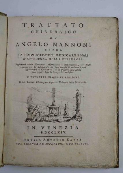 Cm. 25,5, pp. xxiv, 214 + (8) con il fitto catalogo editoriale di Zatta. Con bella insegna tipografica al frontespizio e due tavole fuori testo incise in rame. Legatura in cart. coevo marmorizzato con dorso ricoperto posteriormente da carta azzurra. Sguardie assenti ed alcune fioriture sparse, peraltro esemplare genuino ed in barbe. Angelo Nannoni (1715-1790) lavorò all'ospedale di Santa Maria Nuova a Firenze e fu ardito operatore ed innovatore di interventi chirurgici. Affermò la necessità di operare subito i tumori. Cfr. Blake (319); Pazzini, Biobibl. di storia della chirurgia (168). Particolarmente interessante il suo Trattato chirurgico sopra le malattie delle mammelle. Quest'opera presenta inoltre un interesse particolare per la storia della chirurgia plastica: vi si trova infatti (a p. 36-37) la descrizione del trattamento di una ferita, a seguito della quale il naso era stato quasi interamente staccato dal viso: a questo proposito Nannoni menziona il metodo di Taglicozzi. Cfr. Gnudi-Webster (p. 304): "A. Nannoni was not surprised to witness the reunion of a severed nose in view of the successful work of Tagliacozzi".