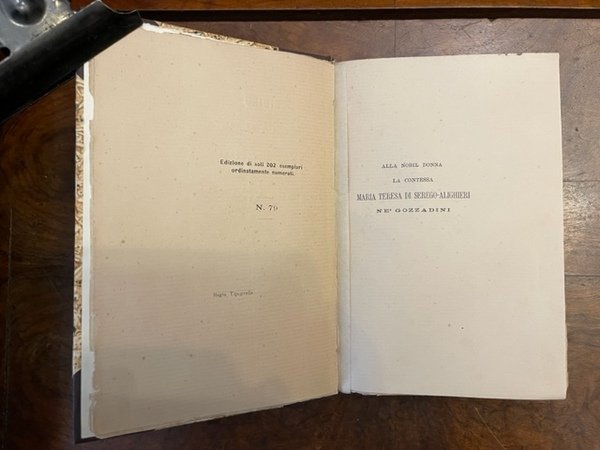 XXXIII, 279, [3] pp.; 18,5 cm. Leg. artigianale nuova in mezza tela muta, cop. originale conservata all'interno. Intonso. Edizione di 202 esemplari numerati (n. 79)