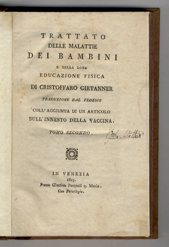 Venezia, presso Giustino Pasquali q. Mario, 1803, volumi 2, in-8, bella legatura coeva in mezza pelle con titolo ed eleganti fregi in oro ai dorsi, piatti in cartone rosato, tagli spruzzati di rosa, pp. XVI, 296, (4); 344, (4). In fine al volume 2° il trattato di Lavather e tavola cronologica (1795-1803) piegata "dei progressi della vaccina in Europa" (divisi per città). Lo svizzero Girtanner (1760-1800) iniziò la carriera come pediatra a St.Gallen, in seguito si dedicò alla medicina a Londra, Parigi e Zurigo, città di Heinrich Lavater (1768-1819), pioniere della vaccinoterapia antivaiolosa. Ottime condizioni, salvo scoloritura al piatto posteriore del volume I.