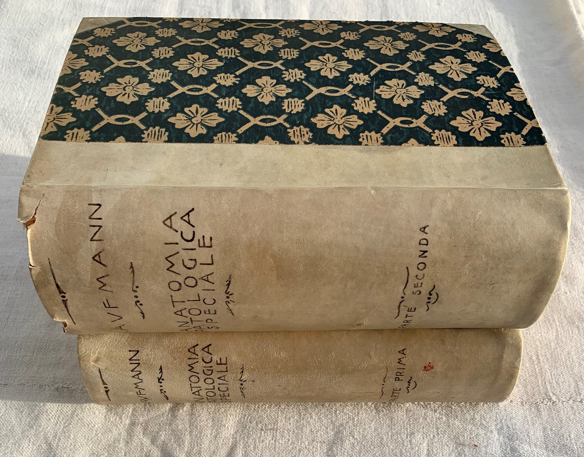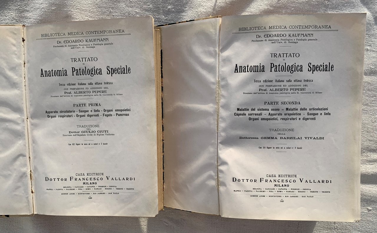 III ed. italiana sull'VIII tedesca (ed. originale: Lehrbuch der speziellen pathologischen Anatomie für Studierende und Ärzte, Berlin, Druck und Verlag von Georg Reimer 1907). Traduzioni: Dottor Giulio Ciuti, Direttore dell'Ospedale Civile di Figline Valdarno (Parte Prima) e Dottoressa Gemma Barzilai Vivaldi (Parte Seconda). Biblioteca Medica Contemporanea. Opera in due volumi: VIII/ XVI+1-920 + VIII+921-2100+(232)=2356/ rilegatura in mezza pergamena con angoli, piatti rifiniti in carta blu con ornato floreale avorio e con titoli e ornati seppia al dorso. I volumi contengono figure in nero nel testo e a colori in tavole patinate f.t. (Parte Prima: con 432 figure in nero ed a colori 3 tavole - Parte Seconda: con 511 figure in nero ed a colori e 4 tavole). Parte Prima (Apparato circolatorio - Sangue e linfa - Organi emopoietici - Organi respiratori - Organi digerenti - Fegato - Pancreas), Traduzione del Dottor Giulio Ciuti (Direttore dell'Ospedale Civile di Figline Valdarno), pp. XVI+1-920=936. Con 432 figure in nero ed a colori e 3 tavole - Parte Seconda (Malattie del sistema osseo - Malattie delle articolazioni - Capsule surrenali - Apparato uropoietico - Sangue e linfa - Organi emopoietici, respiratori e digerenti), Traduzione della Dottoressa Gemma Barzilai Vivaldi, pp. VIII+921-2100+(232)=1420. Con 511 figure in nero ed a colori e 4 tavole. Stato buono dell'opera nel complesso (usura delle copertine, in particolare ai margini - copertine, fogli di guardia e pagine bruniti - firme di possesso a matita agli occhielli).