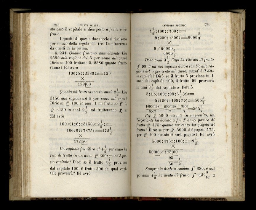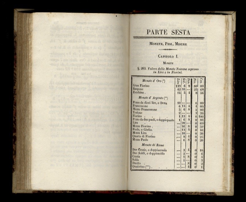 Firenze, Tipografia di P. Fraticelli, 1853, in-16, mezza pelle rossa coeva, titolo e fregi oro al dorso, piatti marmorizzati, pp. 384. Interessante Parte VI, con: valore delle monete toscane espresse in lire, fiorini e corrispondenza colle estere (intendendo anche territori italiani pre-unitari); unità di peso in Toscana e raffronto colle estere; unità di tempo, di lunghezza, di superficie, di solidità, di capacità toscane ed estere per uso agrario e mercantile. Ottime condizioni.