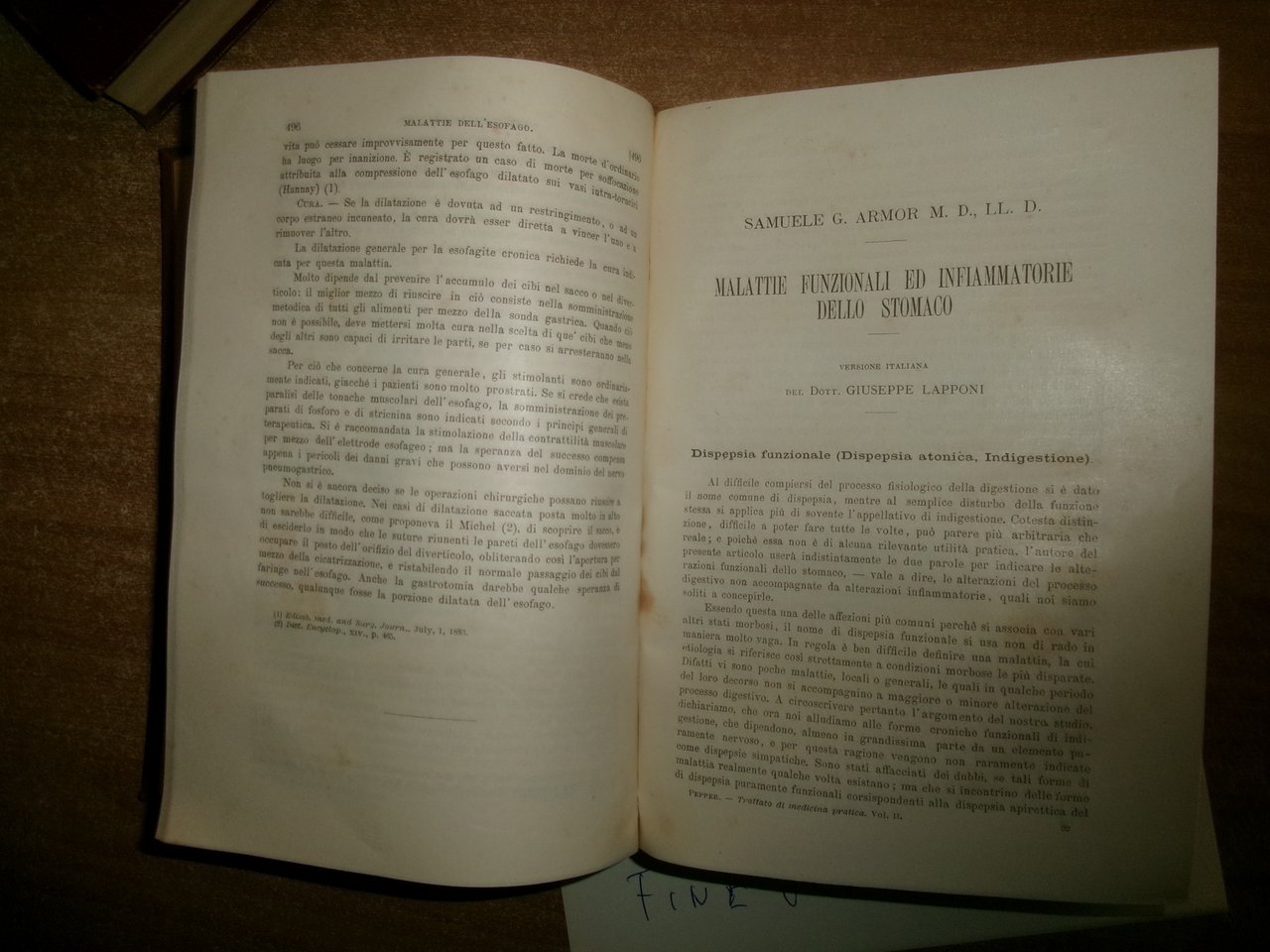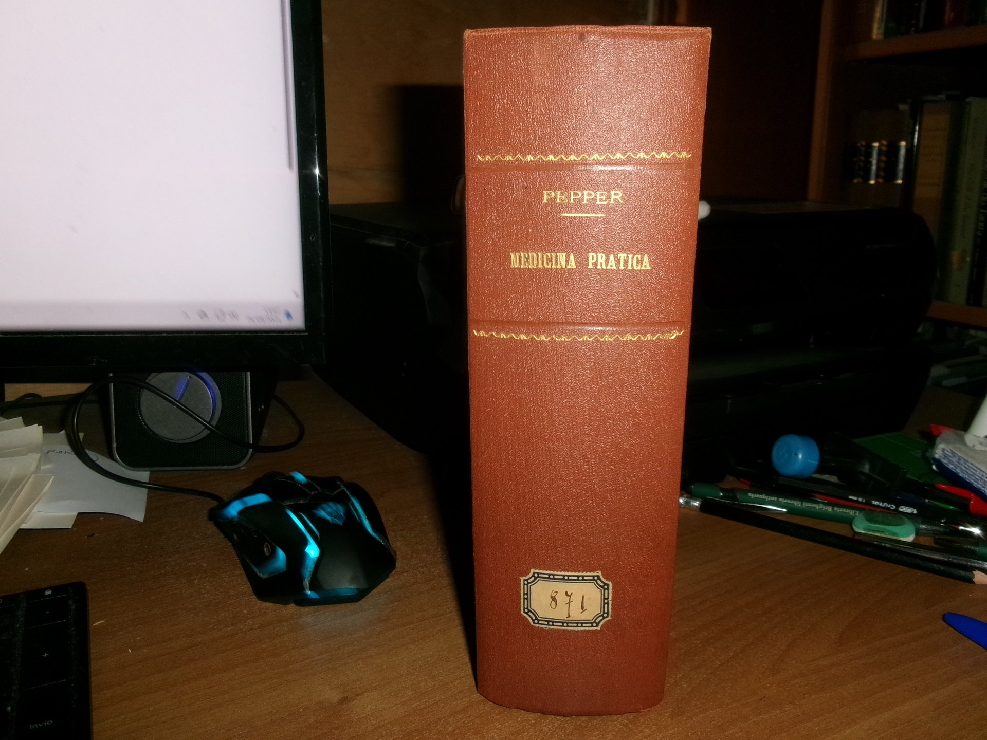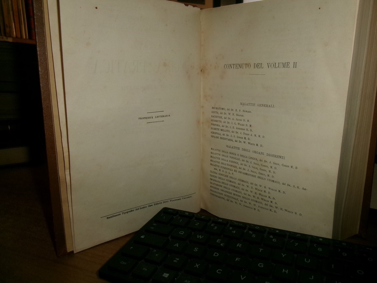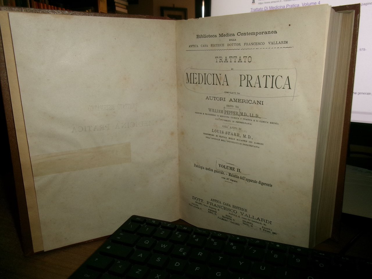 William Pepper - Louis Starr. Milano, Antica Casa Editrice Francesco Vallardi, s.d. (fine 800'). Trattato MEDICINA PRATICA compilato da Autori Americani. Solo volume II. Patologia medica generale.-Malattie dell' apparato digerente. In-8°, m-tela edit. con titolo in oro sul dorso. 1413 pp. con 27 figure n.t. Ottimo stato con lievi fioriture sparse. Ex libris nella prima bianca. Uff. salon. sporta 8