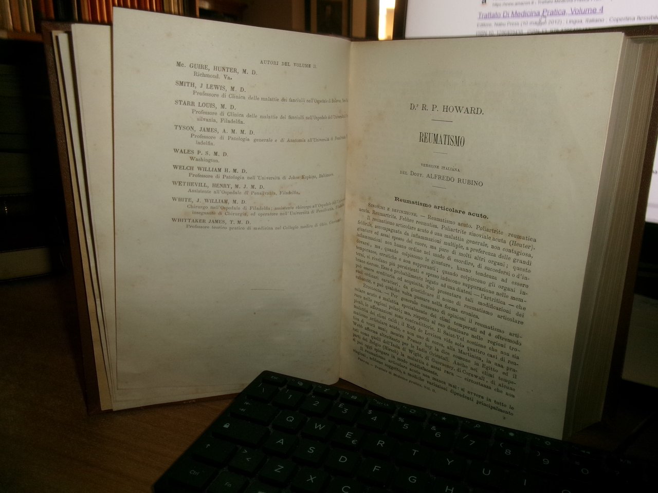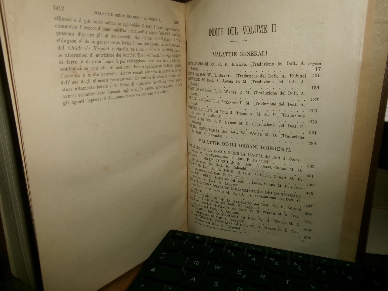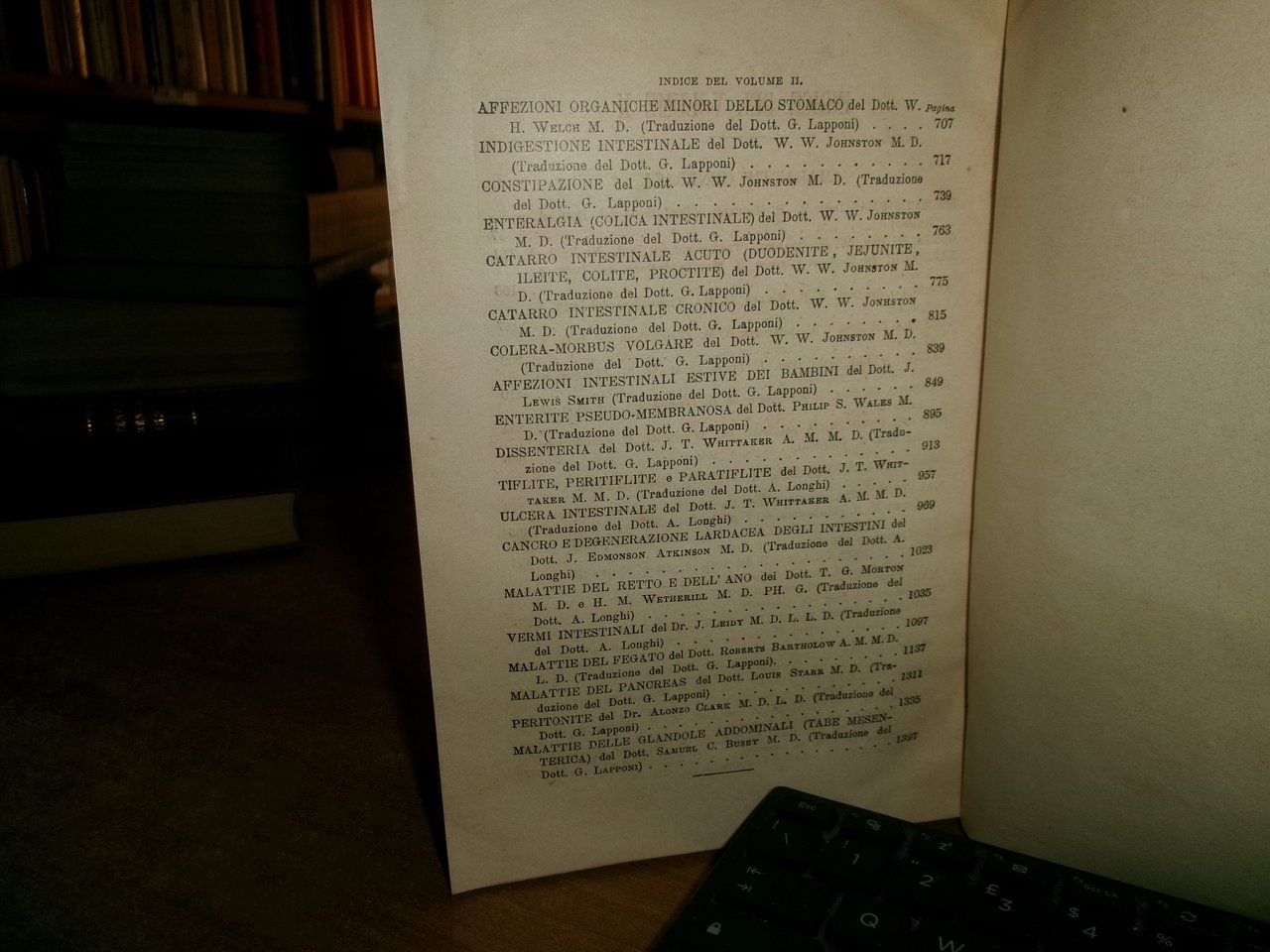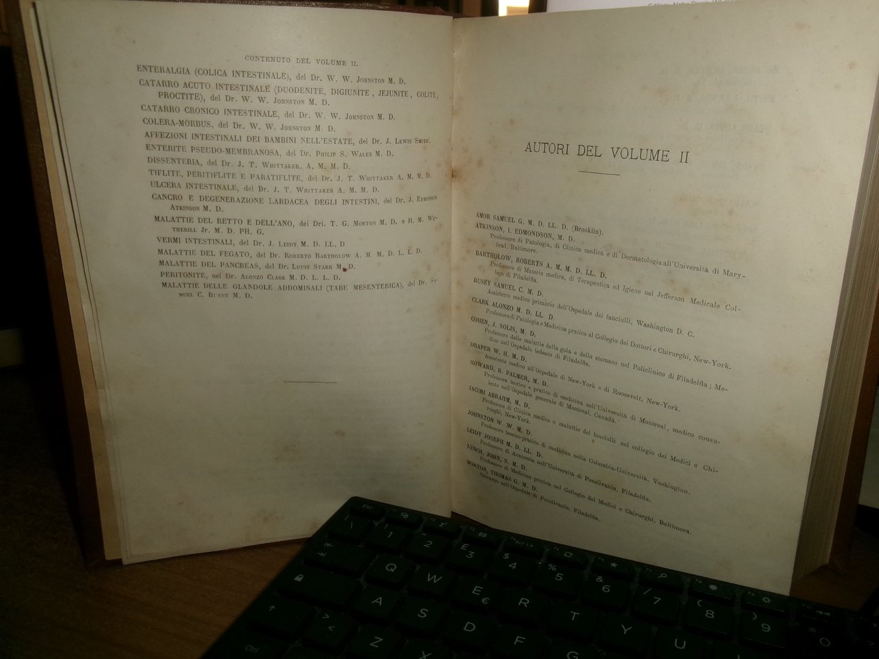 William Pepper - Louis Starr. Milano, Antica Casa Editrice Francesco Vallardi, s.d. (fine 800'). Trattato MEDICINA PRATICA compilato da Autori Americani. Solo volume II. Patologia medica generale.-Malattie dell' apparato digerente. In-8°, m-tela edit. con titolo in oro sul dorso. 1413 pp. con 27 figure n.t. Ottimo stato con lievi fioriture sparse. Ex libris nella prima bianca. Uff. salon. sporta 8