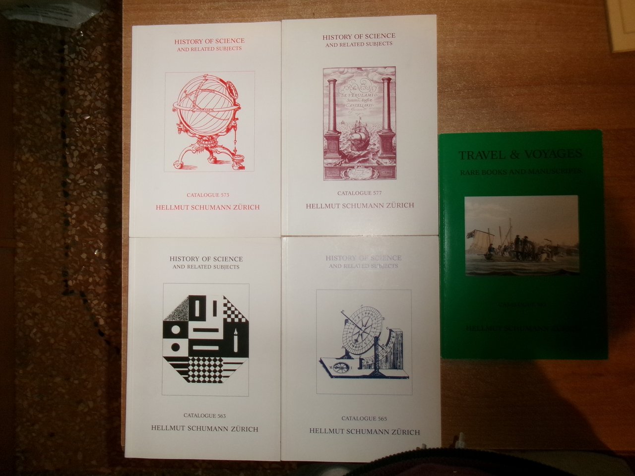 5 catalogue 583 - 563 - 565 - 573 - 577 di Helmutt Schumann. Zurich, 2000/1998/1995/. Travel & Voyages Rare Books and Manuscripts/ History of Science... In-8°, br. Accurata descrizione con prezzi di importanti libri antichi e rari con numerosi fac-simili n.t. Ottimo stato. Neg. magazz. mob. grigio entro busta trasp.