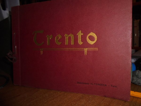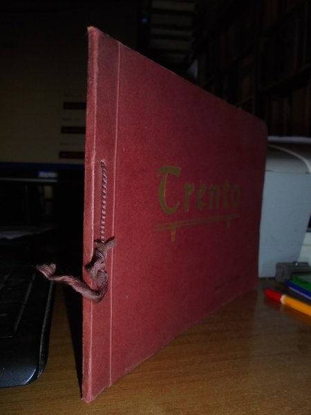 Terni, Stabilimento Alterocca, s.d. (1920). [TRENTINO TRENTO VEDUTE]. In-16° (20x15), cartoncino edit. con laccetto. Album con 12 fotogravure virate seppia protette da veline trasparenti della città di Trento e dei suoi monumenti. Bell’album con legatura in parte a sbalzo, titoli e motivi oro su cartoncino rosso. Alcune inedite inquadrature di grande fascino. Neg. mob. nero W. carc.
