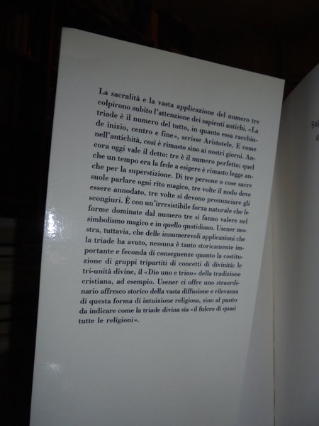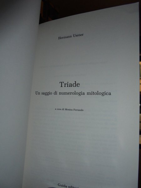 Hermann, Usener. Napoli, Guida Editori, 1993. TRIADE Saggio di numerologia mitologica. A cura di Monica Ferrando. In-8°, cartoncino edit. con risvolti. 214, (3) pp. In ottimo stato di conservazione. Neg. mob. nuovo.