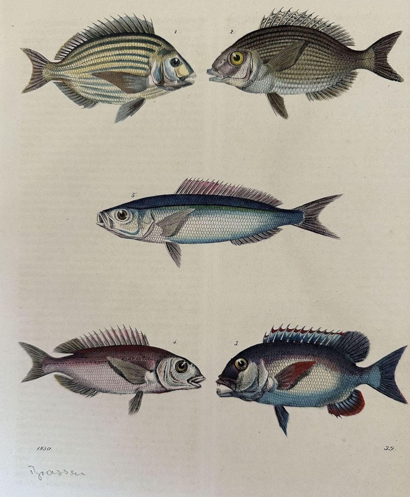 Incisione del 1850 colorata a mano che mostra un gruppo di cinque pesci tra cui una triglia, un Caesio tile, un margate nero. Data: 1850 Tecnica: xilografia acquarellata a mano Dimensione del foglio: 260x205 mm Dimensione incisione: 190x175 mm Condizioni: Buone. Alcune fioriture. Nice woodcut of 1850 coloured by hand representing a group opf five fishes as a mullet, a Caesio tile, a black bream. Date: 1850 Technique: xilography painted by hand Size of the page: 260x205 mm Size of the engraving: 190x175 mm Conditions: Good conditions. Some foxing