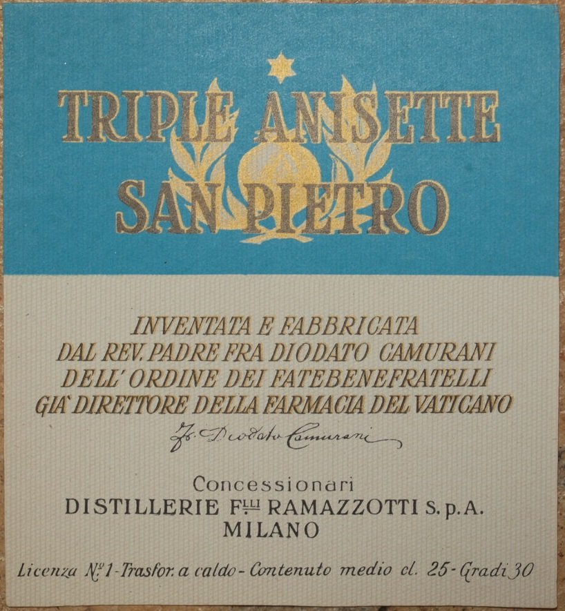 TRIPLE ANISETTE SAN PIETRO INVENTATA E FABBRICATA DAL REV. PADRE FRA DIODATO CAMURANI DELL'ORDINE DEI FATEBENEFRATELLI GIA DIRETTORE DELLA FARMACIA DEL VATICANO CONCESSIONARI DISTILLERIE F.LLI RAMAZZOTTI SPA MILANO<BR>