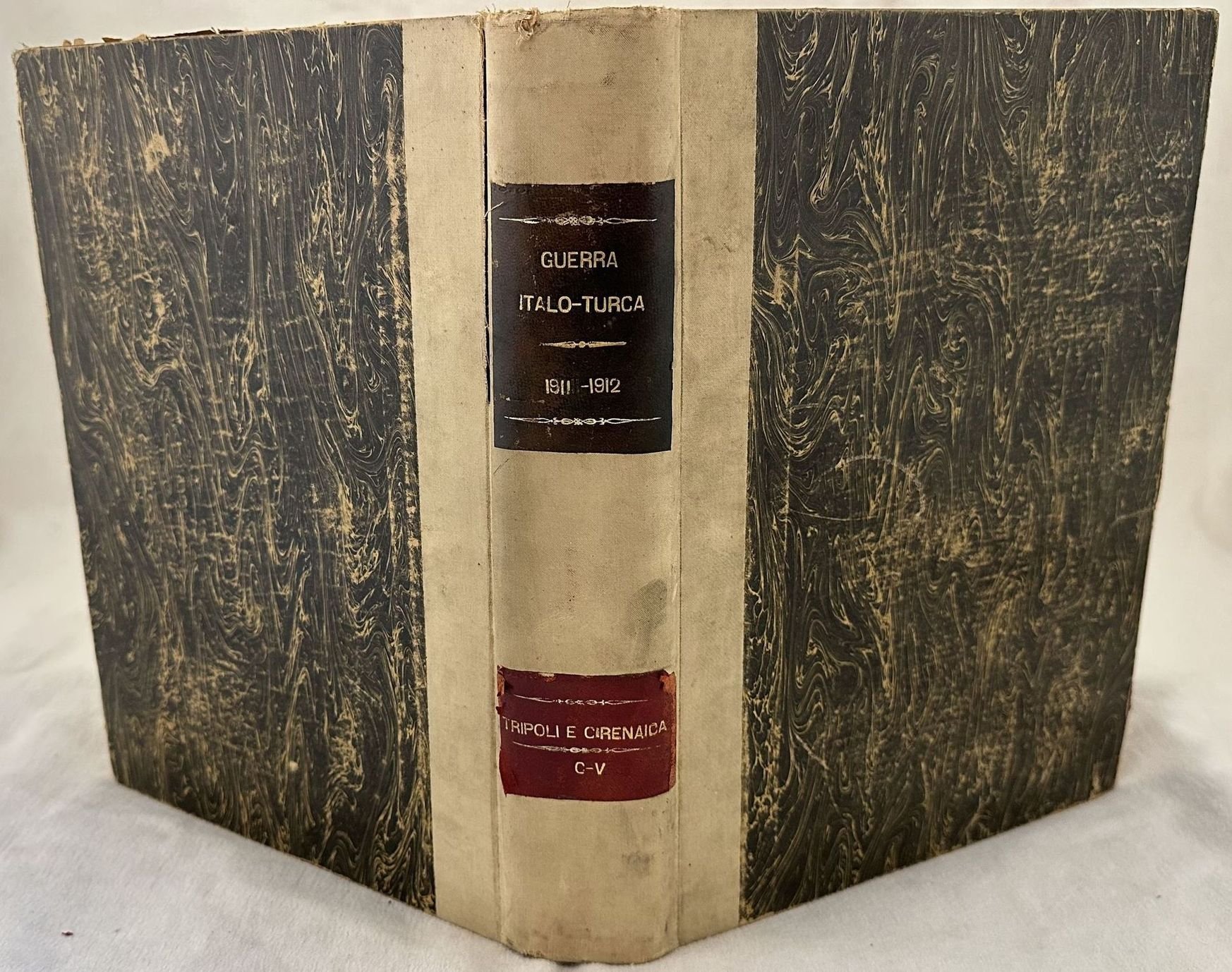 Rara opera del 1912 circa pubblicata da Sonzogno durante la guerra Italo Turca. L'opera è formata dal frontespizio di una grande mappa ripiegata della Guerra Italo Turca (cm 84x57,5) a corredo dell'opera a cura di Giovanni Pacchioni. Seguono tre illustrazioni incollate su due pagine bianche e una raccolta di 119 dispense che illustrano dettagliatamente la Guerra Italo Turco e riportano le notizie della presenza italiana in Libia. Testo riccamente illustrato con foto d'epoca e mappe. In ottime condizioni. Copertina in mezza pergamena con titolo in oro sul tassello al dorso in buone condizioni generali con lievi usure ai margini e dorso. Legatura in buone condizioni. All'interno le pagine si presentano in buone condizioni con rare fioriture. Strappo alla mappa. In 4. Dim. 30,5x23 cm. Pp. 952. Scarce work of 1912 circa published by Sonzogno during Italian Turkish war. The work is made up of the title page of a big folded coloured map of Italian Turkish war (cm 84x57,5) following the work cared by Giovanni Pacchioni. Then three illustrations attached on two blank pages and a collection of 119 instalments illustrating with many details Italian turkish war with the infromation of italian presence in Libia. Text is richly illustrated with photoes and maps. In very good conditions. Half parchment cover with gilted title in the spine in good conditions lightly worn in the extremities with tears. Binding in good conditions. Inside pages are in good conditions with occasional foxing.Tear in the map. In 4. Dim. 30,5x23 cm. Pp. 952.