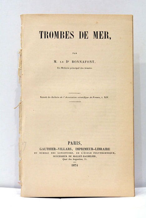 14 pages. (1 feuillet blanc). (21,5x13,5 Cm). Dérelié. Description de six tornades observées sur la côte de l'Algérie par le chirurgien Jean-Pierre Bonnafont qui avait longtemps séjourné en Afrique et qui avait publié un ouvrage sur les tornades en 1859. Rare tiré-à-part du Bulletin de l'Association scientifique de France. Une illustration in-texte. Quelques rousseurs.